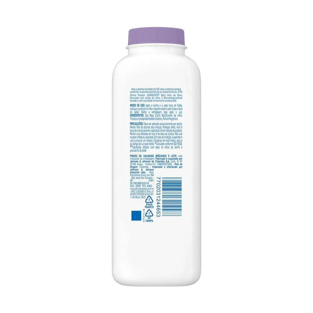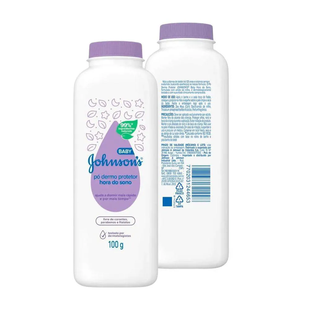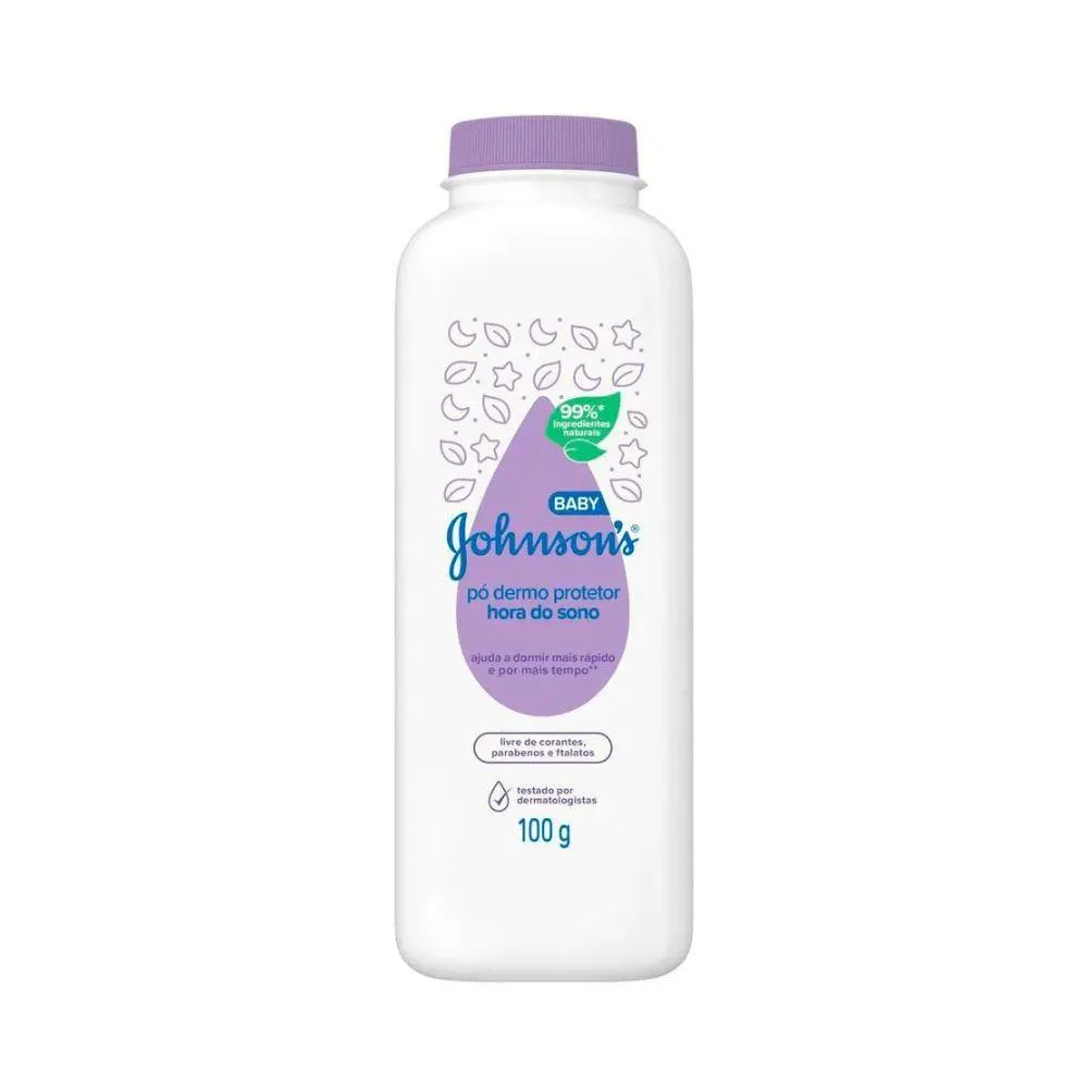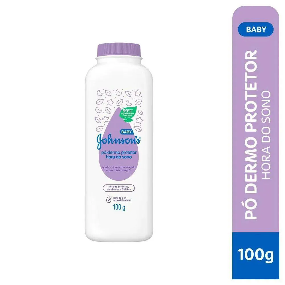Johnsons Baby Hora do Sono - Protecao e conforto na hora do descanso O talco Dermo Protetor Johnsons Baby Hora do Sono foi desenvolvido com 99% de ingredientes naturais e amido de milho para cuidar com carinho da pele do seu bebe. Dermatologicamente testado, protege da umidade, mantem a pele sequinha e macia, e ainda possui o cheirinho classico Johnsons que ajuda o bebe a relaxar e dormir melhor. Livre de corantes, parabenos e ftalatos, e o toque suave que o seu bebe merece apos o banho ou na troca de fraldas. Marca: Johnson s Baby Linha: Hora do Sono Tipo: Talco po dermo protetor Peso liquido: 100g Composicao: 99% de ingredientes naturais e amido de milho Livre de: Corantes, parabenos e ftalatos testes: Dermatologicamente testado Beneficios: Mantem a pele seca, macia e perfumada Indicacao: Uso pos-banho e nas trocas de fraldas Aroma: Cheirinho classico de bebe Johnsons Modo de usar: Aplicar nas maos e espalhar sobre a pele limpa e seca do bebe Advertencias: Evite inalacao e contato com olhos, nariz e boca. Uso exclusivo por adultos.