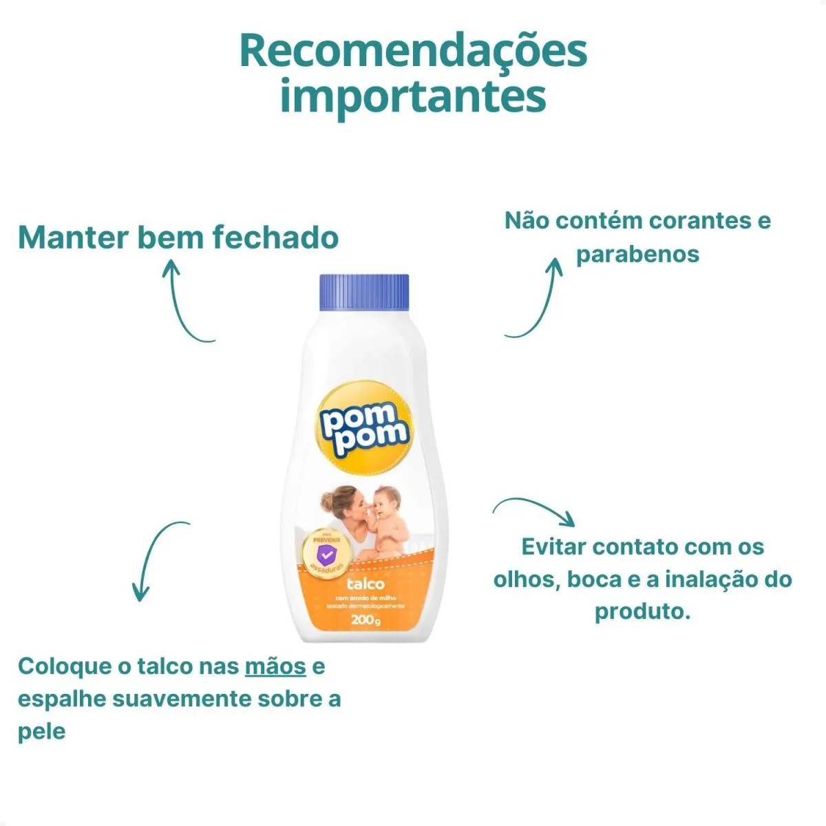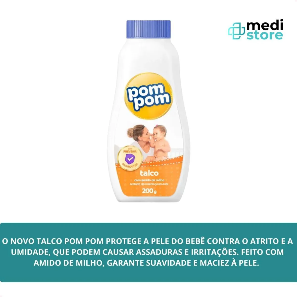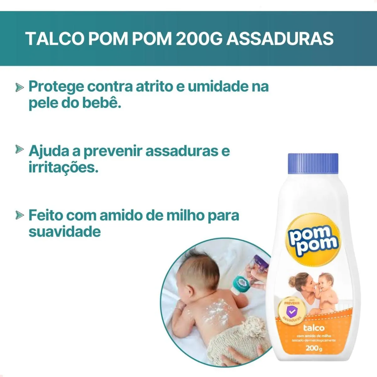 O Talco Infantil Pom Pom 200g foi desenvolvido para ajudar a proteger a pele delicada do bebê contra atrito e umidade, fatores que podem causar assaduras e irritações. Sua fórmula é feita com amido de milho, ingrediente conhecido por proporcionar suavidade e maciez à pele, ajudando a manter o bebê confortável e protegido após o banho ou durante as trocas de fralda. Ideal para o uso diário, o talco Pom Pom contribui para manter a pele do bebê seca, macia e bem cuidada.