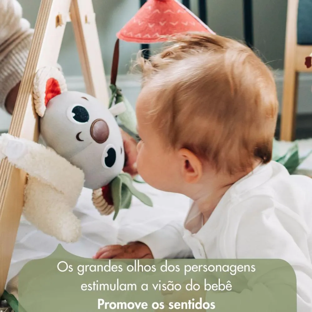 As cores terrosas, texturas divertidas e sons envolventes do tapete de atividades Gymini Luxe Boho Chic, estimulam os sentidos dos bebês desde os primeiros dias. A maravilhosa coleção de atividades e brinquedos vai inspirar o bebê a praticar suas habilidades e passar mais tempo de bruços. Deitado de costas, deixe seu bebê praticar a coordenação motora tentando alcançar e tocar o móbile de eucalipto e o trio de anéis de madeira.