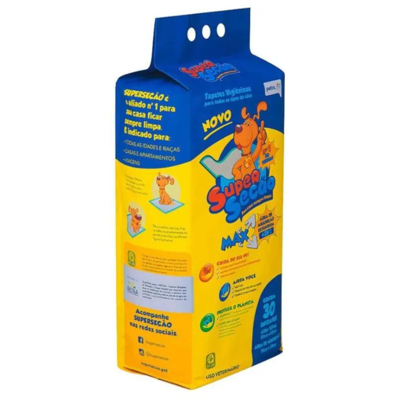 Cada pacote do Tapete Higiênico Super Secão Max contém 30 unidades, oferecendo praticidade para tutores que preferem realizar trocas menos frequentes. Alças no pacote facilitam o transporte para qualquer lugar, tornando-o uma escolha conveniente para tutores ativos.