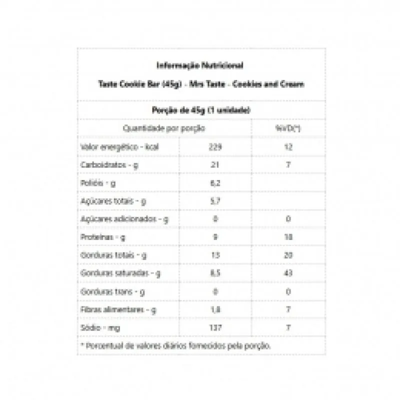 Taste Cookie Bar Display (12 unid 45g)       Taste Cookie Bar é a primeira barrinha de proteína assada! Ela é sem glúten, com 9g de proteínas e está disponível em 4 sabores muuuito crocantes! A crocância aliada ao sabor inigualável da Taste Cookie Bar. Experimente e se surpreenda!   Benefícios: - 9g de Proteína; - Sem glúten; - Textura macia; - Sabor irresistível;