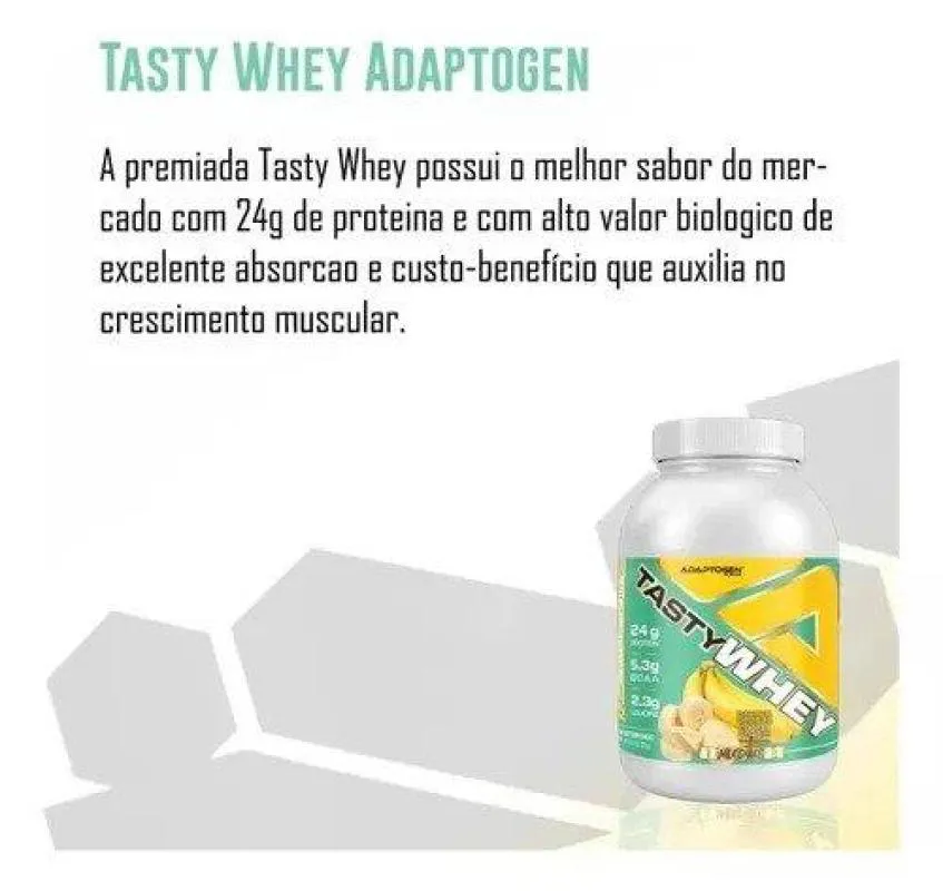 Tasty Whey 3W Adaptogen Banana Cream 900g – A Proteína Mais Saborosa do MercadoA Tasty Whey 3W da Adaptogen é a escolha ideal para quem busca sabor excepcional e benefícios reais no crescimento muscular. Com 24g de proteína por porção, esta proteína do soro do leite é de alto valor biológico, garantindo excelente absorção e ajudando na recuperação pós-treino.Diferenciais: