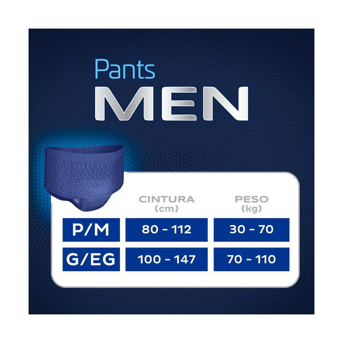 Disponível na cor azul marinho e em dois tamanhos, P/M e G/EG, a roupa íntima Tena Pants Men oferece tripla proteção contra vazamentos, mau odores e umidade, garantindo alto poder de absorção graças ao seu centro de absorção frontal. Ainda, conta com formato anatômico e discreto que se molda perfeitamente ao corpo, sendo fácil de vestir e tirar.