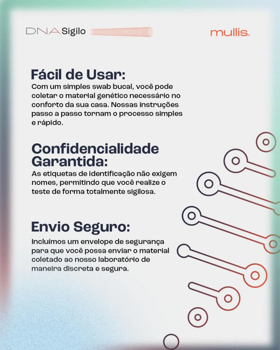 Você sabe para onde ir quando precisar de respostas!Assim que utilizar o kit faça a ativação do mesmo no link abaixo, desta forma conseguiremos lhe enviar a etiqueta para retorno das amostras coletadas e realizar o rastreamento até nosso laboratório. mullis.com.br/ativacao/Resultado Rápido: Receba seu laudo em até 3 dias úteis após o recebimento das amostras em nosso laboratório.Fácil, seguro e discreto: Não pedimos nomes ou outras informações pessoais. Apenas seu e-mail para envio do resultado. Todas as pessoas envolvidas são identificadas por códigos, garantindo total privacidade.Autocoleta sem complicações: Coleta simples e confortável, feita por você em casa usando um swab bucal. O processo é rápido, indolor e totalmente não invasivo.Resultado confiável: Nossas análises de paternidade seguem padrões internacionais, com 99,9999% de precisão. Nosso controle de qualidade comprova que as amostras bucais são tão eficazes quanto as de sangue.Praticidade ao seu alcance: Compre online, receba o kit em casa e colete as amostras no conforto do seu lar. Estamos aqui para ajudar você a esclarecer suas dúvidas.Conteúdo do Kit:1 Manual do usuário com instruções detalhadas de coleta;1 tubo com cápsula dessecante identificado com o código do suposto pai para armazenamento do Swab após a coleta;1 tubo com cápsula dessecante identificado com o código da suposta mãe para armazenamento do Swab após a coleta;1 tubo com cápsula dessecante identificado com o código do(a) suposto(a) filho(a) para armazenamento do Swab após a coleta;3 Swabs bucais para coleta (uma para cada participante);1 envelope para envio seguro do seu kit para o laboratório Mullis Diagnóstico.Dúvidas Frequentes:1. Por que o kit de vocês não inclui duas coletas diferentes para prova e contraprova?Graças à nossa tecnologia avançada de extração de DNA e equipamentos de ponta, realizamos tanto a prova quanto a contraprova com uma única coleta de cada participante. O Mullis Diagnóstico é o único laboratório com infraestrutura própria, eliminando a dependência de terceiros. Isso nos permite oferecer um processo mais eficiente e preciso, sem redundâncias desnecessárias.2. Já fiz a coleta, mas não recebi o e-mail. O que faço?Após usar o kit, é essencial ativá-lo em nosso site. Só assim poderemos gerar a etiqueta para o retorno das amostras e rastreá-las até o laboratório. Acesse o site do Mullis e selecione o botão "Ative seu Kit".OBS.: Lembrando que o envio da logística reversa realizada após a ativação é um processo manual realizado por nossas atendentes dentro do horário comercial. Fique tranquilo, ele será enviado.3. Já enviei as amostras de volta ao laboratório e ainda não recebi resposta. O que aconteceu?A logística reversa é um fator importante, pois depende da estrutura dos serviços dos correios e não temos controle. Assim que as amostras chegam ao laboratório, o resultado é enviado por e-mail (cadastrado no sistema) em até 3 dias úteis.4. Posso usar esse kit para testar outras relações de parentesco?Não, este kit é específico para testes de paternidade e maternidade (pai, mãe e filho), mas você pode conferir em nossa loja a disponibilidade de outros kits, como paternidade (simples), maternidade (simples) e reconstituição de avós.5. Posso usar esse kit para coletar amostras de cabelos ou unhas?Não, esse kit é padronizado para coleta das amostras com swab bucal.