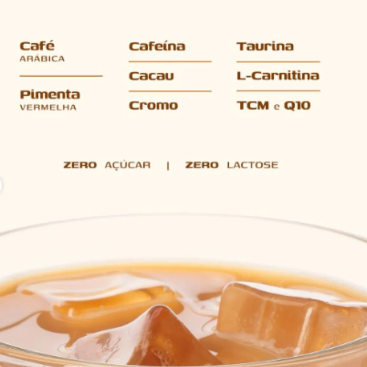 Triglicerídeos de cadeia média, cacau em pó, taurina, café solúvel, L-tirosina, bitartarato de colina (Colina), L-carnitina, cafeína, L-ascorbato de sódio (Vit. C), canela em pó, coenzima Q10, maltodextrina, pimenta vermelha, niacinamida (Vit. B3), sulfato de zinco monohidratado (Zinco), D–pantotenato de cálcio (Vit. B5), picolinato de cromo (Cromo), cloridrato de piridoxina (Vit. B6), tiamina mononitrato (Vit. B1), riboflavina (Vit. B2), sulfato cúprico (Cobre), ácido fólico, selenito de sódio (Selênio), D-biotina (biotina) e cianocobalamina (Vit. B12); Agente de massa: polidextroses; Aromatizantes: aromas sintéticos idênticos ao natural; Antiumectantes: dióxido de silício e silicato de magnésio hidratado (talco); Estabilizante: citrato trissódico; Emulsificante: lecitina; Edulcorantes: acessulfame de potássio, sacarina sódica e sucralose.Recomendação de uso