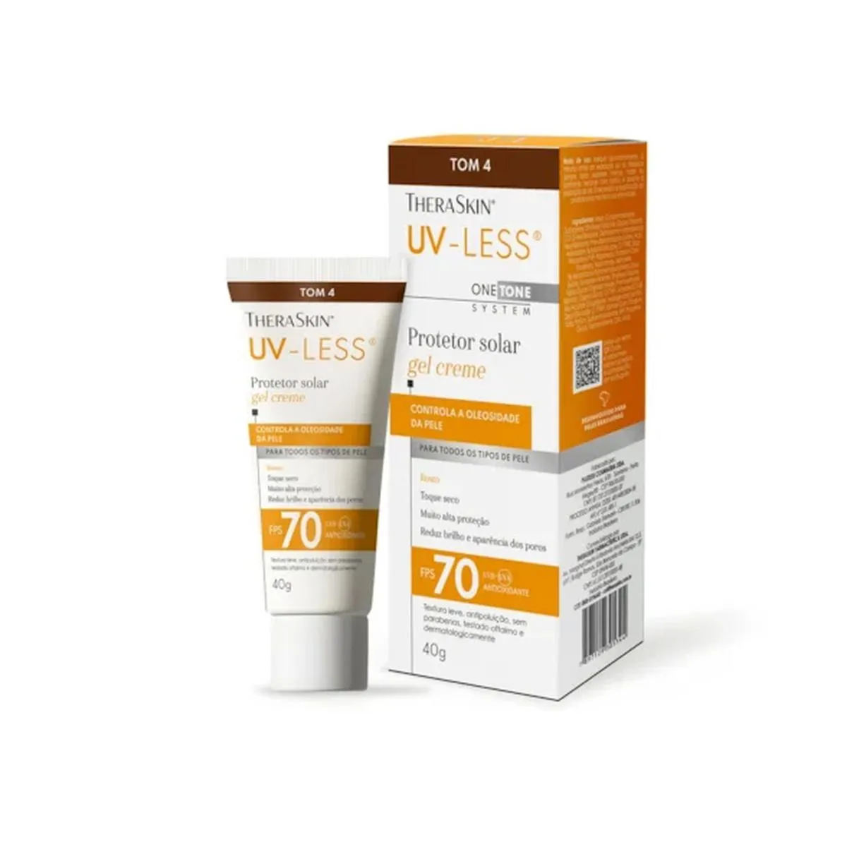 O TheraSkin UV-LESS FPS70 Tom 4 é um protetor solar facial com cor e textura gel creme, ideal para peles negras. Proporciona alta proteção contra raios UVA, UVB e luz visível, com cobertura uniforme, toque seco e acabamento natural. Características:- FPS70 com ampla proteção UVA e UVB