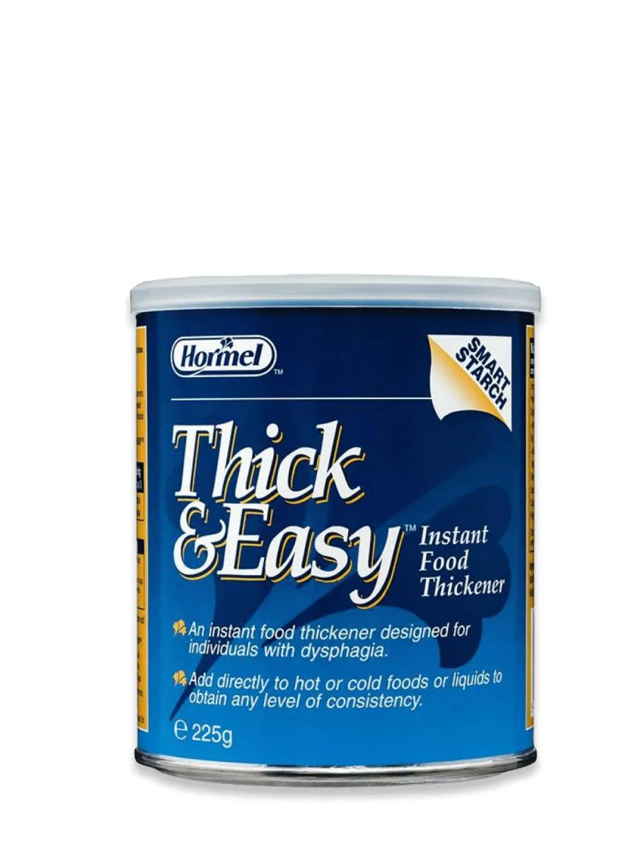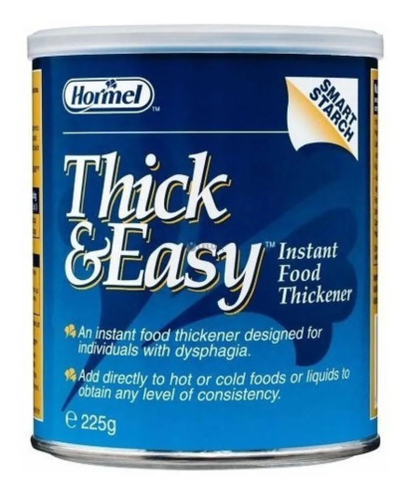 Thick & Easy é um espessante instantâneo de alimentos e bebidas, frias ou quentes, à base de amido de milho modificado. Permite as consistências xarope, mel ou pudim de acordo com a necessidade do paciente e dosagem indicada. Embalagem: Lata 225gIndicação