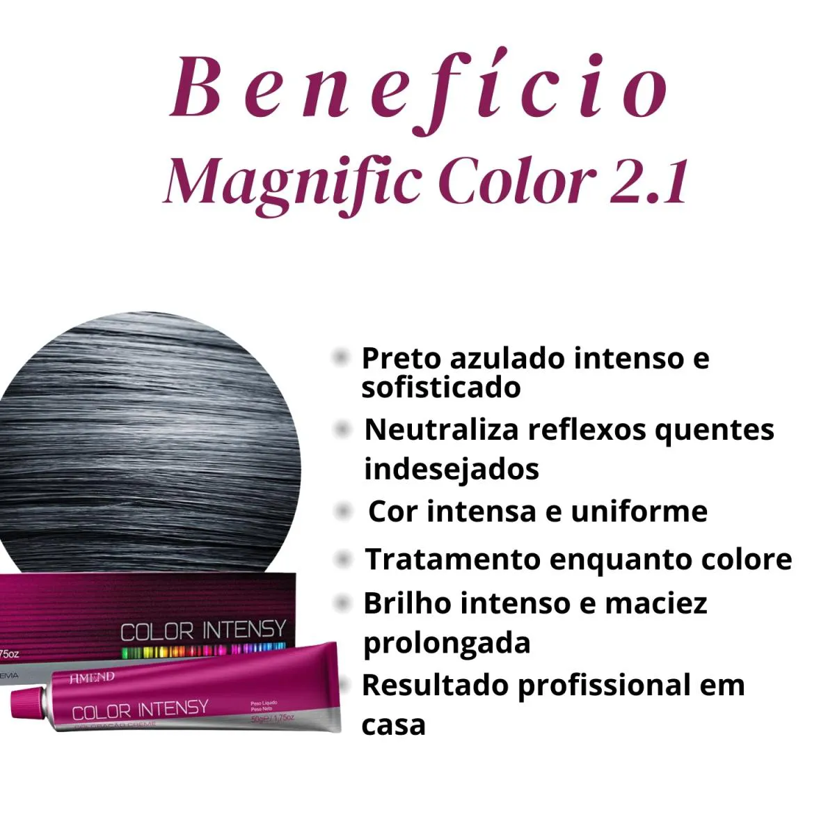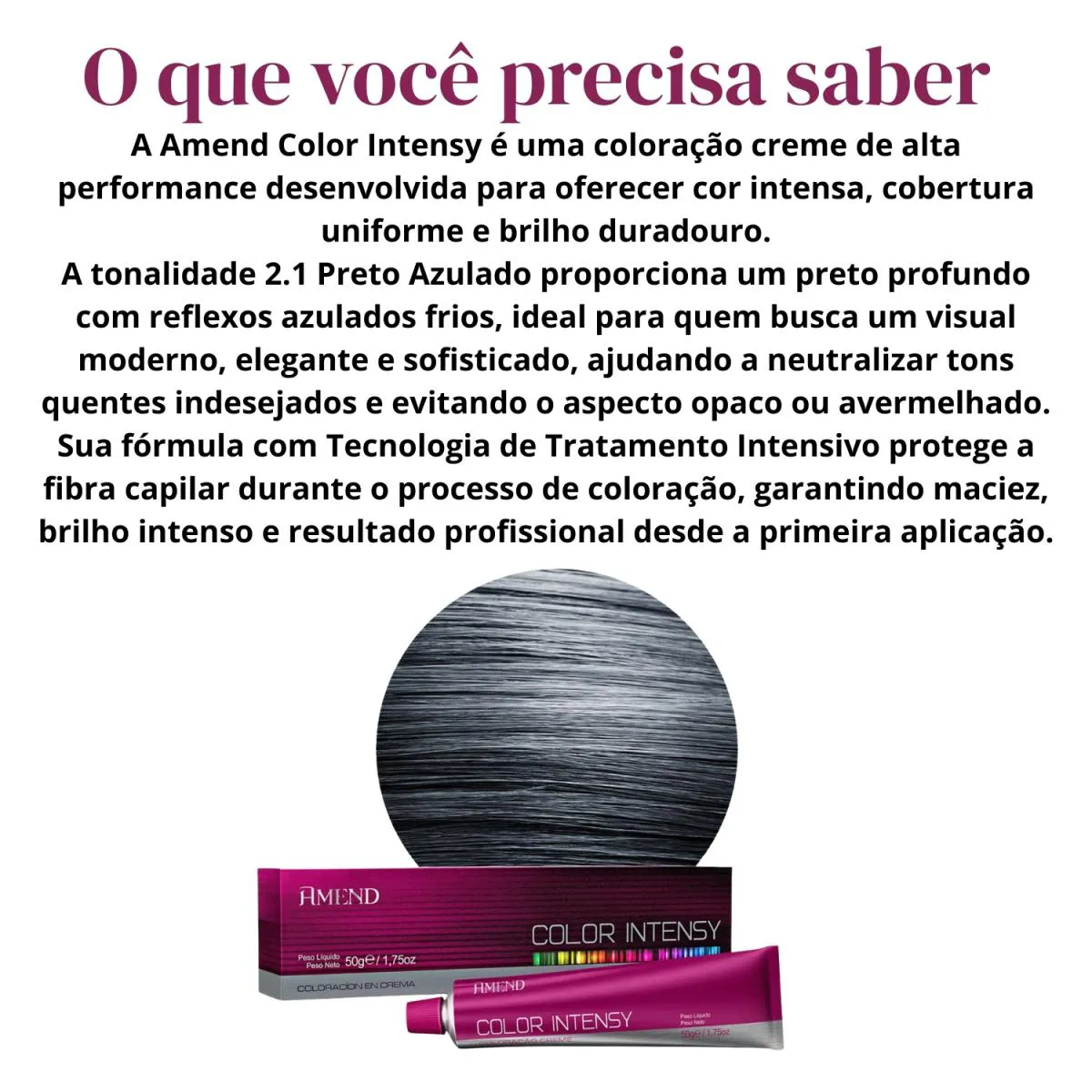 Loja Oficial Beleza Marcante A Beleza Marcante cosméticos é uma loja virtual que, há mais de 8 anos, cuida com carinho da beleza de pessoas modernas e atualizadas. Com um olhar atento, buscamos oferecer produtos inovadores que realçam a beleza natural e promovem o bem-estar. ESTOQUE DISPONÍVEL – ENVIO IMEDIATO APÓS CONFIRMAÇÃO DA COMPRA – ENVIAMOS PARA TODO O BRASIL – NOTA FISCAL – FOTOS REAIS – DIRETO DA FÁBRICA • Loja Oficial na plataforma • 8+ anos entre os melhores vendedores • Atendimento humanizado • Variedade completa de produtos de qualidade • Entrega rápida e segura • Compras 100% seguras Este anúncio contém: 1 unidade – Amend Color Intensy Coloração Creme 2.1 Preto Azulado 50g Descrição Geral A Amend Color Intensy 2.1 Preto Azulado é ideal para quem busca um preto profundo, sofisticado e com reflexo frio, eliminando o aspecto avermelhado indesejado dos tons escuros. Sua tecnologia proporciona cor intensa, uniforme e duradoura, com excelente cobertura dos fios brancos e acabamento profissional. O reflexo azulado garante um visual moderno, elegante e luminoso, deixando os cabelos com aparência saudável e brilho intenso. Além da alta performance na coloração, sua fórmula cremosa facilita a aplicação e contribui para fios macios, sedosos e bem tratados após o processo. Benefícios • Preto intenso com reflexo azulado frio • Neutraliza tons quentes indesejados • Excelente cobertura dos fios brancos • Cor uniforme e duradoura • Brilho intenso e acabamento profissional • Textura cremosa de fácil aplicação Indicação • Indicada para coloração total ou retoque de raiz • Ideal para quem deseja um preto elegante e sem reflexos avermelhados • O resultado pode variar conforme a base natural ou colorida do cabelo Modo de Uso Em um recipiente não metálico, misture a coloração com o oxidante indicado pelo fabricante. Aplique nos cabelos secos e não lavados, conforme a técnica desejada. Respeite rigorosamente o tempo de pausa indicado na embalagem. Enxágue bem até a água sair clara e finalize com tratamento pós-coloração. Importante: realize sempre o teste de mecha antes da aplicação. Como conservar • Manter fora do alcance de crianças • Conservar em local fresco e ao abrigo de luz intensa • Não ingerir • Em caso de contato com os olhos, enxaguar imediatamente com água abundante • Uso externo FAQ – Perguntas Frequentes 1. Essa cor é realmente preta ou puxa para azul? É um preto intenso com reflexo azulado frio, visível sob a luz, sem ficar artificial. 2. Cobre fios brancos? Sim. Oferece ótima cobertura quando aplicada corretamente. 3. Ajuda a neutralizar tons avermelhados? Sim. O reflexo azul neutraliza tons quentes indesejados. 4. Pode ser usada em retoque de raiz? Sim, seguindo a técnica correta. 5. O resultado varia conforme o tom base? Sim. A cor final pode variar conforme a base e o histórico químico.