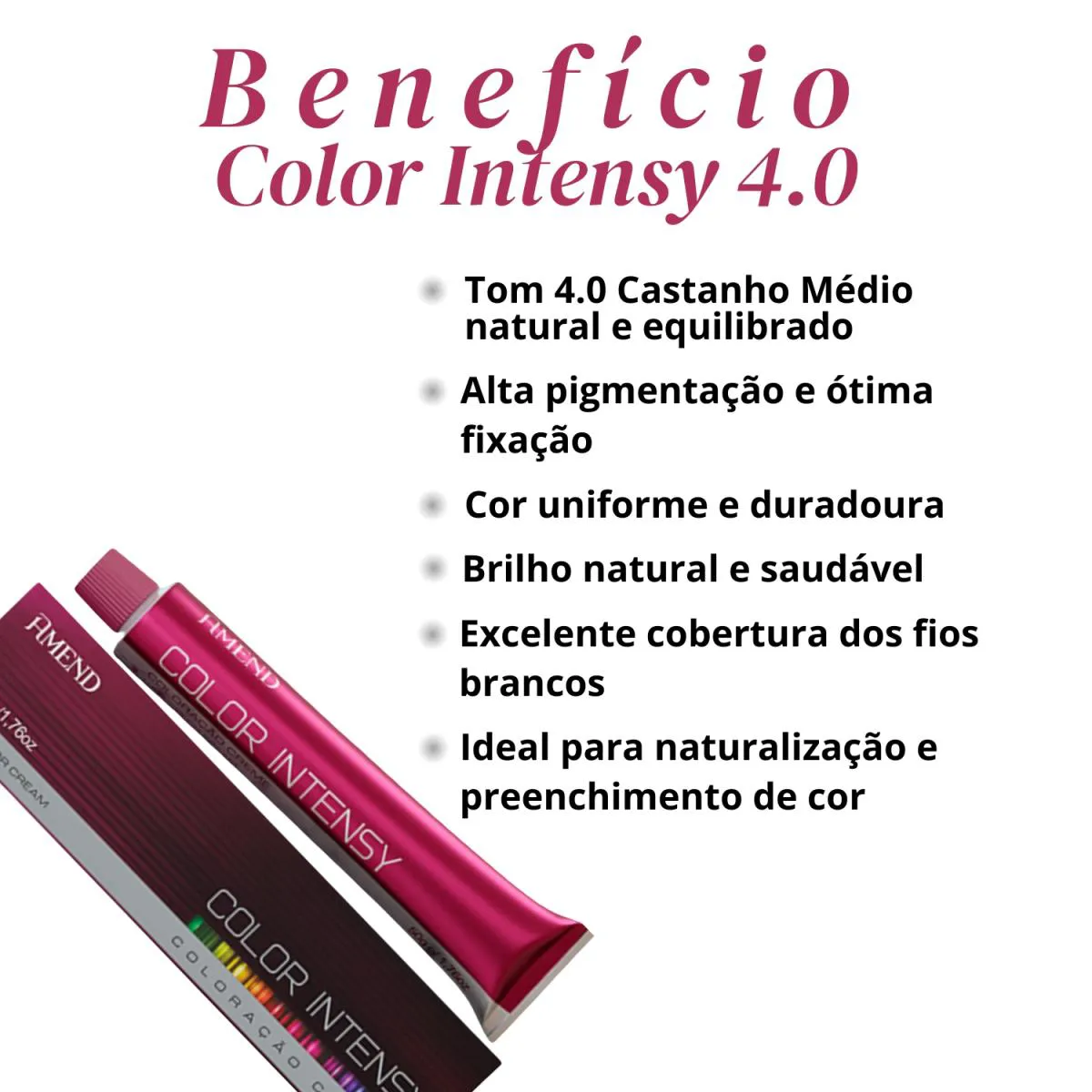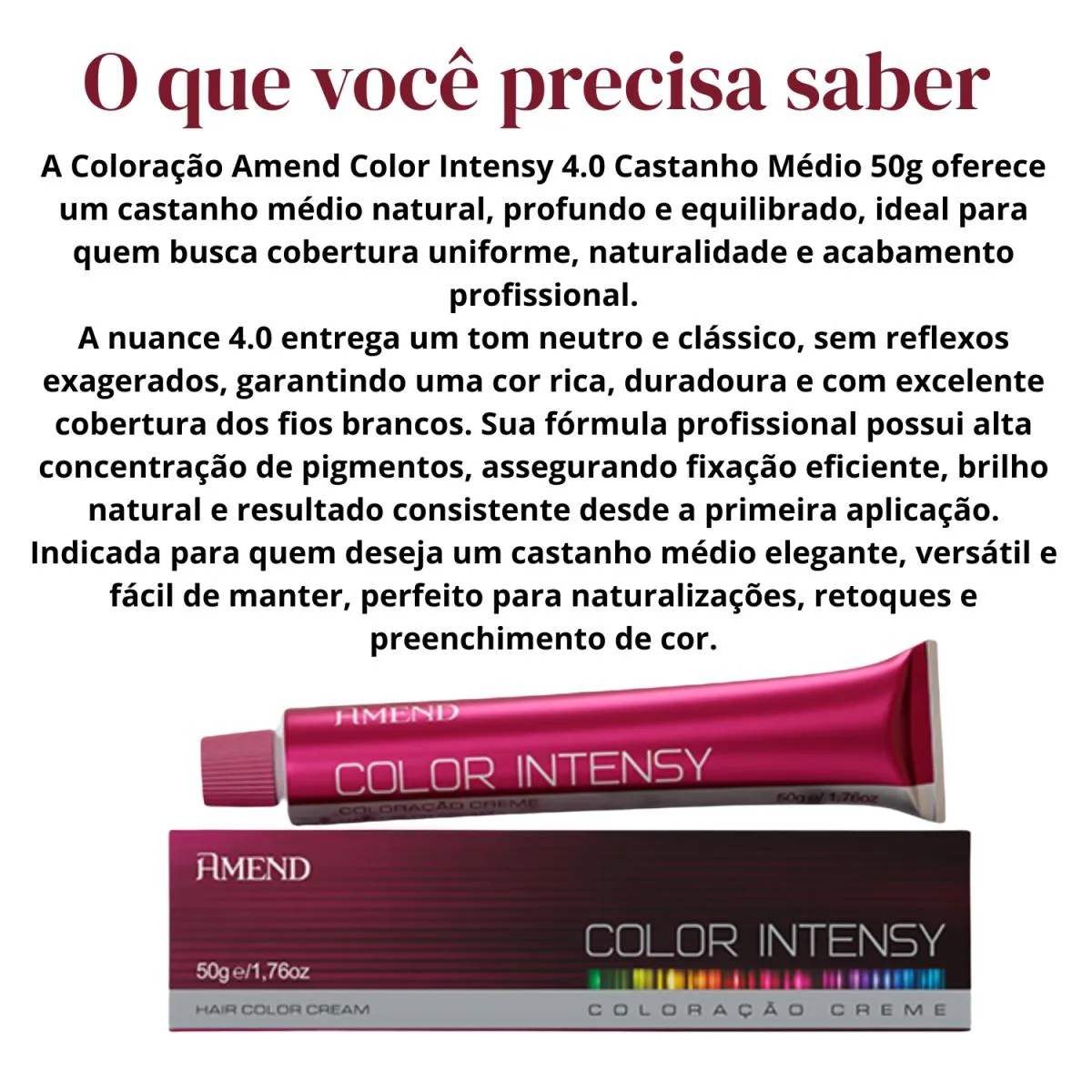 Loja Oficial Beleza Marcante A Beleza Marcante cosméticos é uma loja virtual que, há mais de 8 anos, cuida com carinho da beleza de pessoas modernas e atualizadas. Com um olhar atento, buscamos oferecer produtos inovadores que realçam a beleza natural e promovem o bem-estar. ESTOQUE DISPONÍVEL – ENVIO IMEDIATO APÓS CONFIRMAÇÃO DA COMPRA – ENVIAMOS PARA TODO O BRASIL – NOTA FISCAL – FOTOS REAIS – DIRETO DA FÁBRICA • Loja Oficial na plataforma • 8+ anos entre os melhores vendedores • Atendimento humanizado • Variedade completa de produtos de qualidade • Entrega rápida e segura • Compras 100% seguras Este anúncio contém: 1 unidade – Tinta de cabelo Amend Color Intensy 4.0 Castanho Médio 50g Descrição Geral A Tinta de Cabelo Amend Color Intensy 4.0 Castanho Médio oferece coloração permanente de alto desempenho, ideal para quem busca um castanho clássico, uniforme e natural, com cobertura total dos fios brancos e tratamento durante o processo de coloração. Sua fórmula avançada combina pigmentos de alta intensidade com ativos condicionantes que tratam os fios enquanto colorem, garantindo resultado profissional, brilho intenso e maciez perceptível desde a primeira aplicação. O tom 4.0 Castanho Médio proporciona uma cor equilibrada, elegante e profunda, perfeita para quem deseja realçar a beleza natural dos cabelos com acabamento sofisticado e duradouro. Benefícios • Coloração permanente de alta performance • Cor intensa, uniforme e duradoura • Cobertura total dos fios brancos • Brilho intenso e toque macio • Tratamento durante a coloração • Resultado profissional • Ideal para uso em casa ou profissional Modo de Uso Em um recipiente não metálico, misture a coloração com a água oxigenada apropriada (vendida separadamente), conforme a técnica desejada. Aplique nos cabelos secos e não lavados, respeitando a divisão em mechas. Deixe agir pelo tempo indicado na embalagem. Enxágue bem até a água sair limpa. Finalize com shampoo e condicionador adequados para cabelos coloridos. Recomenda-se realizar teste de mecha e prova de toque antes da aplicação. Como conservar • Manter fora do alcance de crianças • Conservar em local fresco e ao abrigo da luz • Uso externo FAQ – Perguntas Frequentes 1. Cobre cabelos brancos? Sim. Possui cobertura total dos fios brancos. 2. É uma coloração permanente? Sim, trata-se de coloração permanente. 3. Precisa de água oxigenada? Sim. A água oxigenada é necessária e vendida separadamente. 4. Pode ser usada em cabelos quimicamente tratados? Sim, desde que seja realizado o teste de mecha. 5. O tom fica natural? Sim. O 4.0 Castanho Médio entrega um resultado clássico, equilibrado e natural.