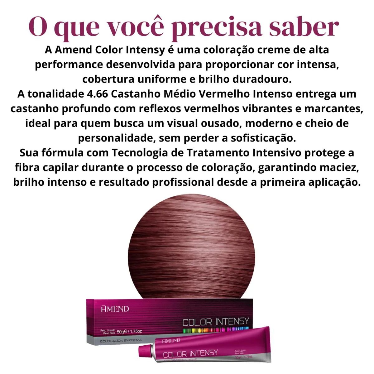 Loja Oficial Beleza Marcante A Beleza Marcante cosméticos é uma loja virtual que, há mais de 8 anos, cuida com carinho da beleza de pessoas modernas e atualizadas. Com um olhar atento, buscamos oferecer produtos inovadores que realçam a beleza natural e promovem o bem-estar. ESTOQUE DISPONÍVEL – ENVIO IMEDIATO APÓS CONFIRMAÇÃO DA COMPRA – ENVIAMOS PARA TODO O BRASIL – NOTA FISCAL – FOTOS REAIS – DIRETO DA FÁBRICA • Loja Oficial na plataforma • 8+ anos entre os melhores vendedores • Atendimento humanizado • Variedade completa de produtos de qualidade • Entrega rápida e segura • Compras 100% seguras Este anúncio contém: 1 unidade – Amend Color Intensy 4.66 Castanho Médio Vermelho Intenso 50g Descrição Geral O Amend Color Intensy 4.66 Castanho Médio Vermelho Intenso é uma coloração creme profissional desenvolvida para quem deseja um vermelho profundo, vibrante e altamente pigmentado, com fundo castanho que garante sofisticação e intensidade equilibrada. A numeração 4.66 indica um castanho médio com duplo reflexo vermelho, proporcionando cor intensa, luminosa e marcante desde a primeira aplicação. Ideal para quem busca tons avermelhados encorpados, modernos e de alta fixação. Sua fórmula de alta performance oferece cobertura uniforme, brilho intenso e excelente durabilidade, além de textura cremosa que facilita a aplicação e promove resultado profissional. Benefícios • Castanho médio com vermelho intenso e profundo • Duplo reflexo vermelho para máxima intensidade • Cor vibrante, uniforme e duradoura • Brilho intenso e acabamento profissional • Textura cremosa de fácil aplicação • Excelente fixação da cor Indicação • Indicado para quem deseja tons vermelhos intensos e sofisticados • Ideal para bases castanhas claras a médias • Uso profissional ou doméstico com conhecimento técnico • Pode ser combinado com intensificadores vermelhos para maior vibrância Modo de Uso Em recipiente não metálico, misture a coloração com o oxidante conforme a volumagem indicada pelo fabricante. Aplique nos cabelos secos e não lavados. Distribua uniformemente da raiz às pontas. Respeite o tempo de pausa indicado na embalagem. Enxágue bem até a água sair limpa e finalize com tratamento pós-coloração. Importante: realize sempre o teste de mecha antes da aplicação. Como conservar • Manter fora do alcance de crianças • Conservar em local fresco e ao abrigo de luz intensa • Não ingerir • Em caso de contato com os olhos, enxaguar imediatamente com água abundante • Uso externo FAQ – Perguntas Frequentes 1. Esse tom é bem vermelho? Sim. Possui duplo reflexo vermelho, garantindo intensidade elevada. 2. Fica muito aberto ou mais fechado? O fundo castanho médio equilibra o vermelho, deixando o tom intenso, porém sofisticado. 3. Pode ser usado em cabelo natural escuro? O resultado varia conforme a base. Em bases muito escuras, o reflexo pode ficar mais discreto. 4. Posso misturar com intensificador vermelho? Sim, para potencializar ainda mais a vibração da cor. 5. Cobre fios brancos? Possui boa cobertura, podendo variar conforme a porcentagem de fios brancos.