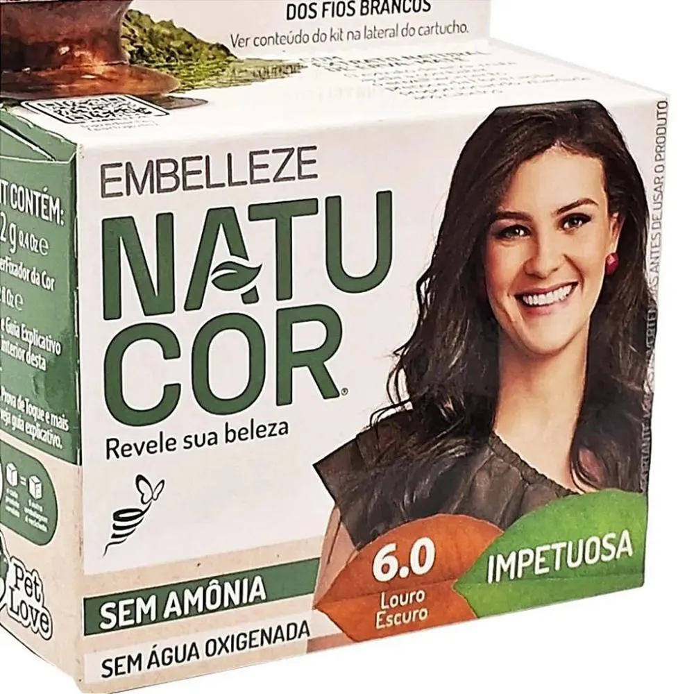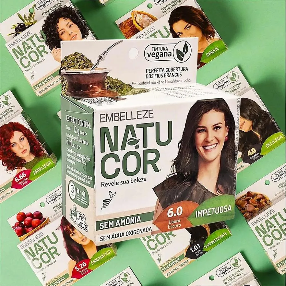 É um kit de tintura capilar suave da marca Embelleze Natucor, desenvolvido para coloração de cabelos com uma fórmula vegana e livre de ingredientes agressivos como chumbo, água oxigenada e amônia.