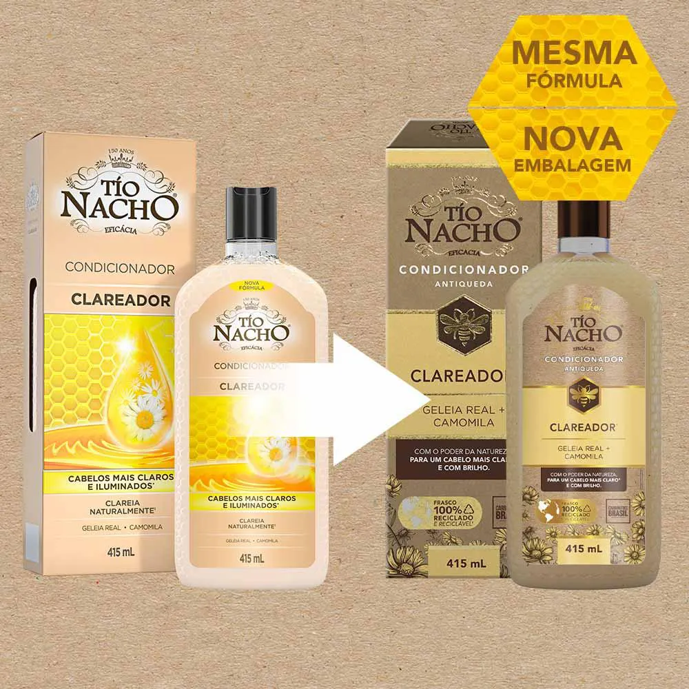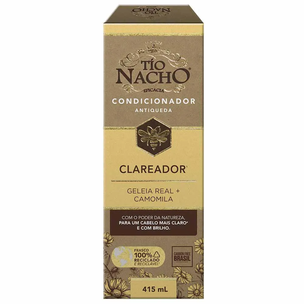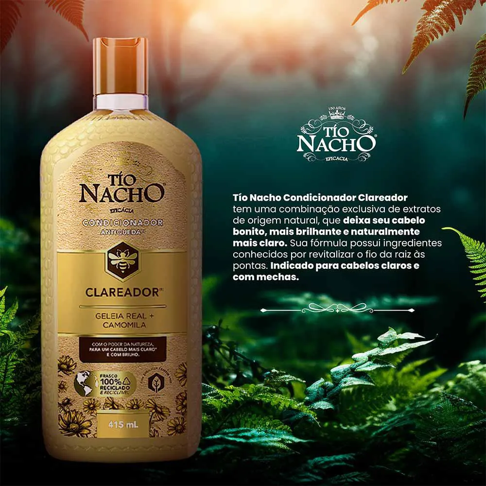O Tio Nacho Condicionador Clareador é um produto capilar com uma combinação exclusiva de extratos naturais, desenvolvido especificamente para clarear e revitalizar os cabelos. Sua fórmula contém ingredientes naturais como geleia real, camomila e outros extratos que atuam no fio capilar.