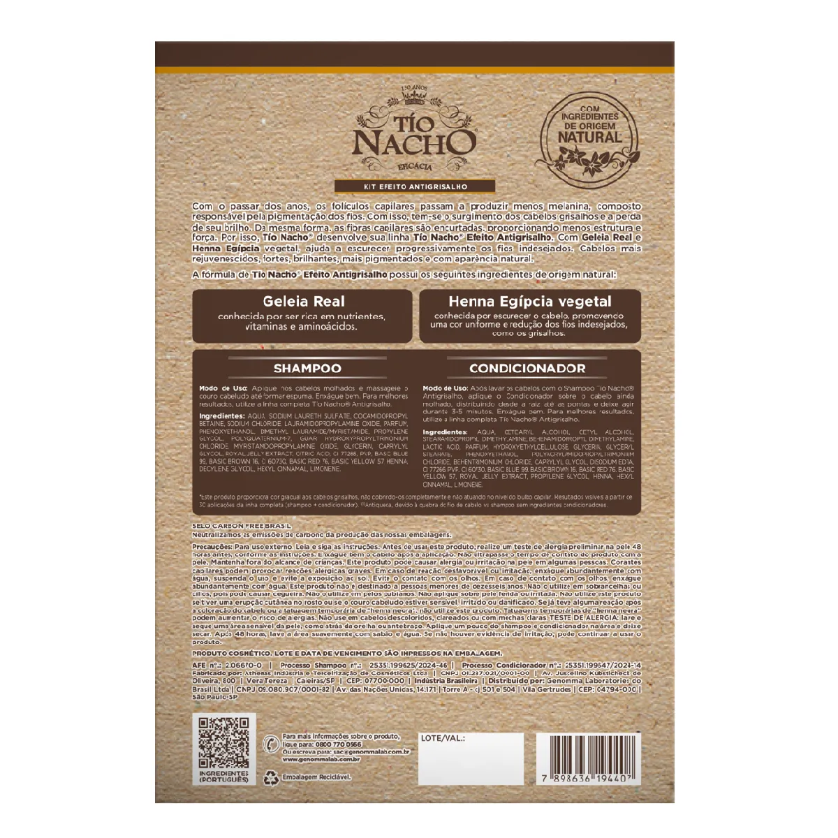 O Kit Tio Nacho Anti Grisalho Shampoo + Condicionador foi desenvolvido para ajudar a reduzir gradualmente o aparecimento dos fios grisalhos, proporcionando uma aparência natural e rejuvenescida aos cabelos. Formulado com geleia real e henna egípcia vegetal, o kit nutre profundamente, fortalece a fibra capilar e devolve o brilho e a vitalidade dos fios. Ideal para quem busca cuidar dos cabelos e suavizar os sinais do tempo de forma natural.
