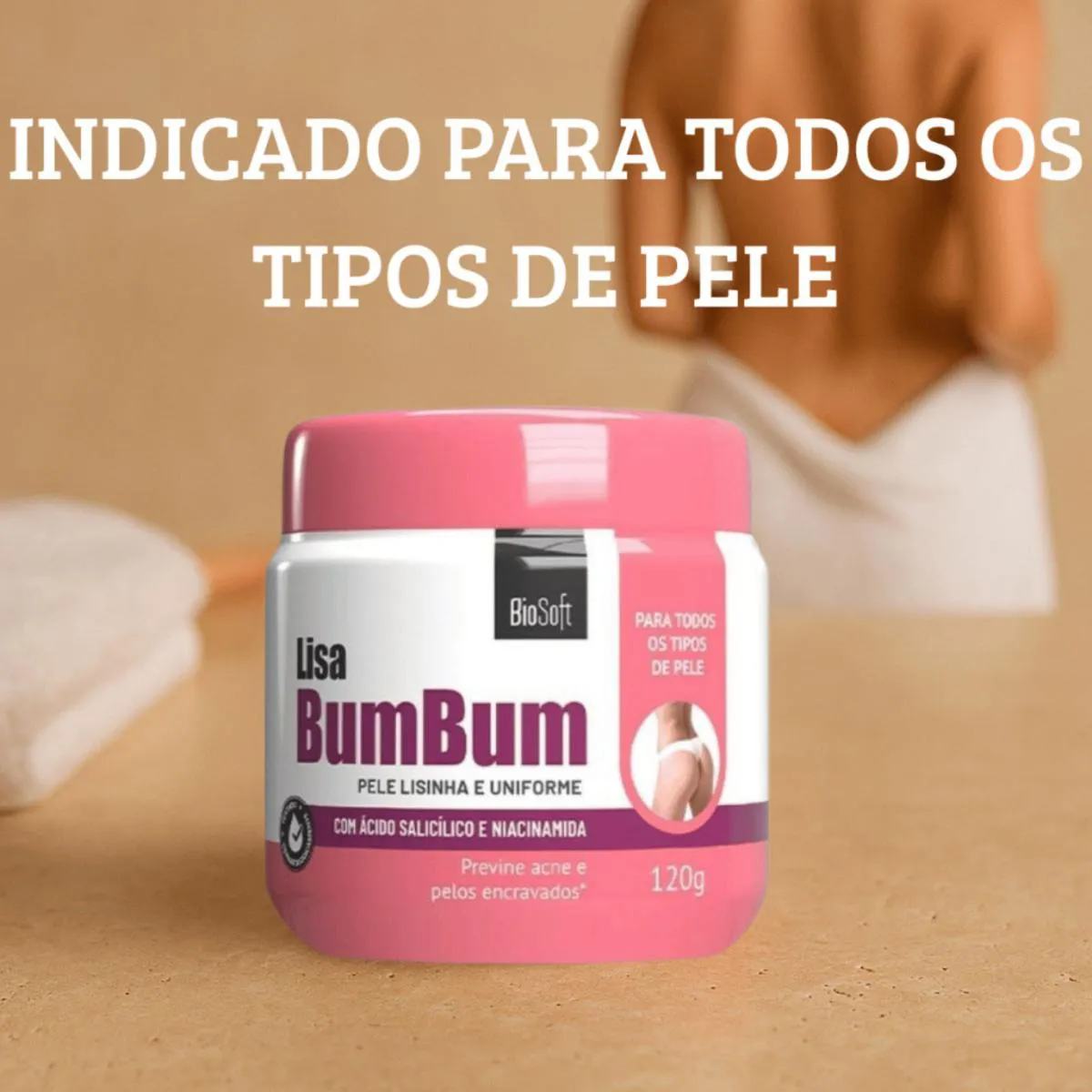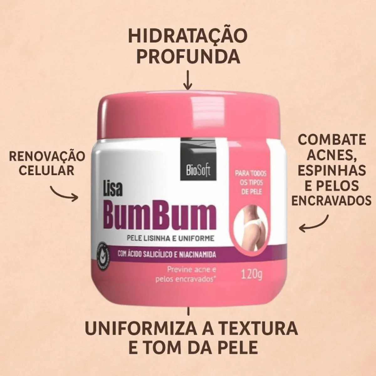 Creme Anti-Espinhas no Bumbum – desenvolvido para tratar e prevenir aquelas indesejadas bolinhas e espinhas, promovendo uma pele lisa, renovada e livre de marcas.