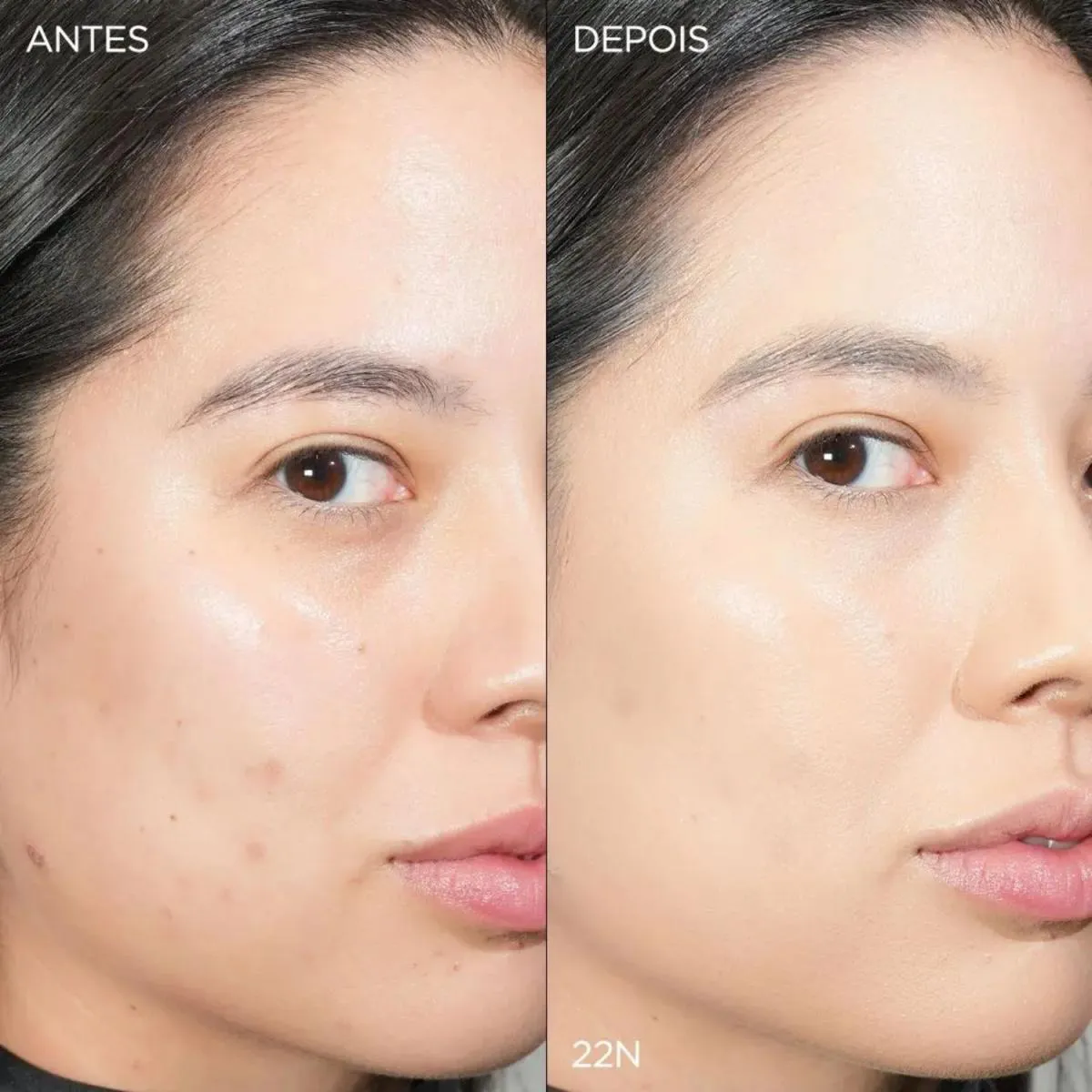Pressione levemente a esponja aplicadora na almofada de base e aplique sobre a pele com leves batidinhas até obter a cobertura desejada. Resultado:
