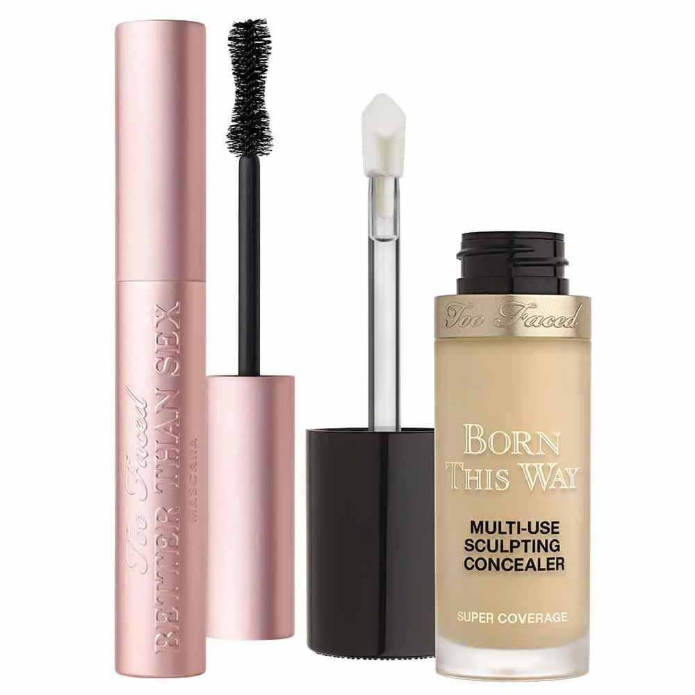 Descubra o poder transformador do Too Faced Kit - Máscara de Cílios Better Than Sex + Corretivo Líquido Born This Way Super Coverage, uma combinação que eleva sua maquiagem a um nível profissional.