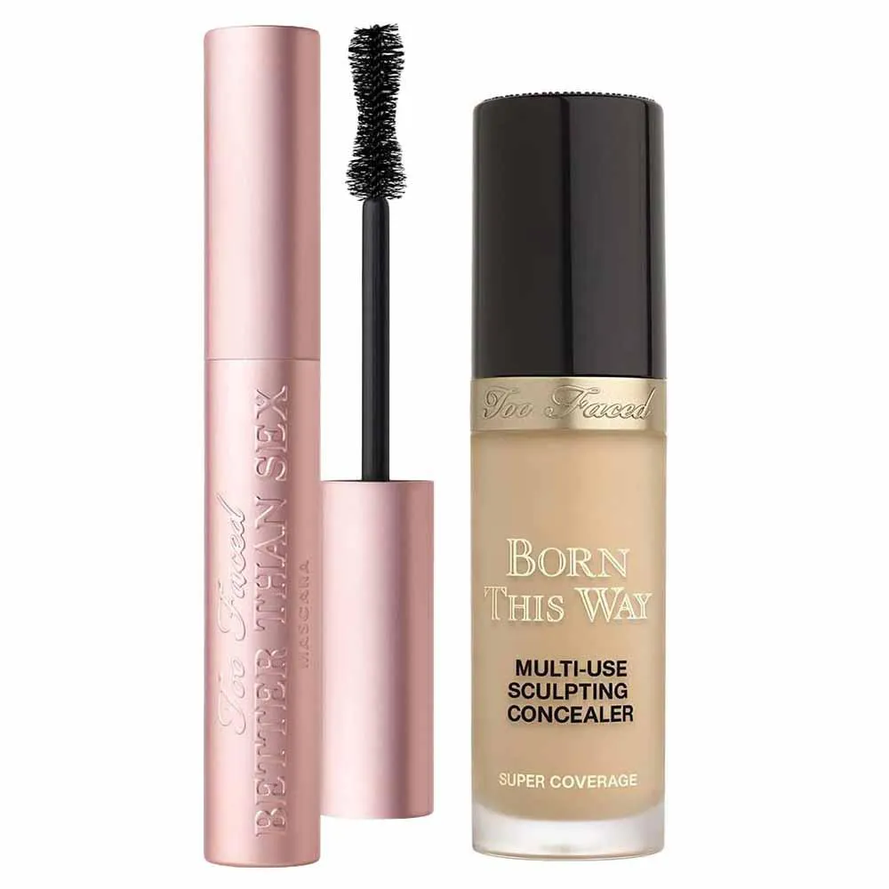 Descubra o poder transformador do Too Faced Kit - Máscara de Cílios Better Than Sex + Corretivo Líquido Born This Way Super Coverage, uma combinação que eleva sua maquiagem a um nível profissional.
