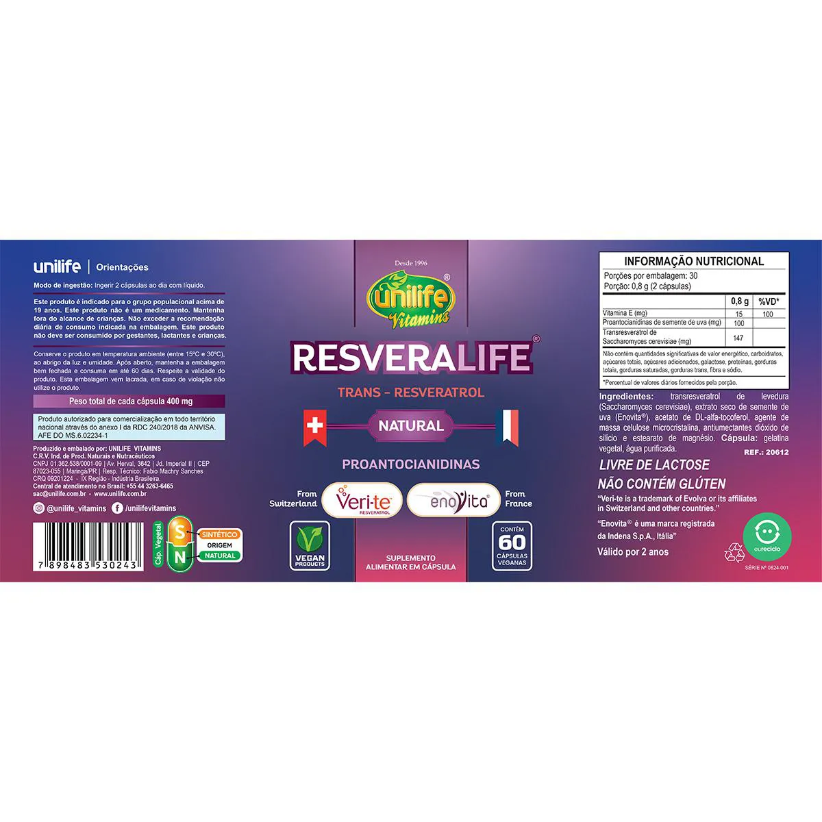 Trans Resveratrol Resveralife Unilife 60 Cápsulas