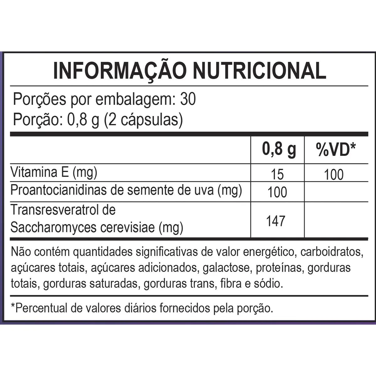 Transresveratrol de levedura, extrato seco de semente de uva, acetato de DL-alfa-tocoferol, agente de massa celulose microcristalina, antiumectantes dióxido de silício e estearato de magnésio. Cápsula: gelatina vegetal, água purificada.