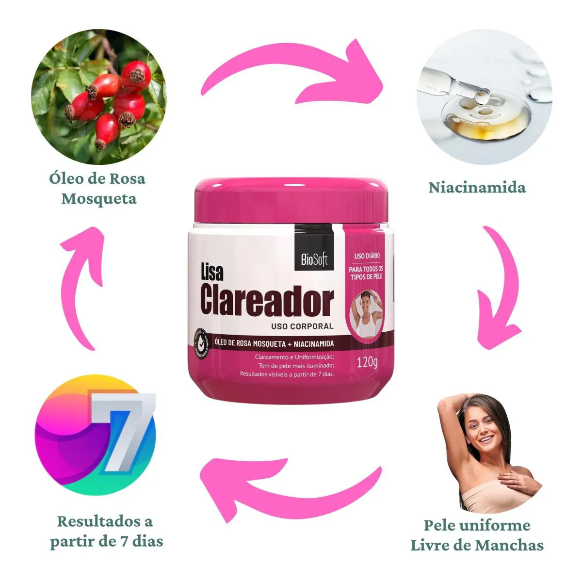 É um kit clareador corporal composto por um creme clareador e um óleo de rosa mosqueta, desenvolvido especificamente para uniformizar e clarear áreas do corpo com manchas escuras, como virilha, axilas, joelhos e cotovelos. O tratamento tem como objetivo principal reduzir gradualmente a aparência de manchas escuras, promovendo uma pele mais clara, uniforme e radiante, com ação regeneradora e hidratante.