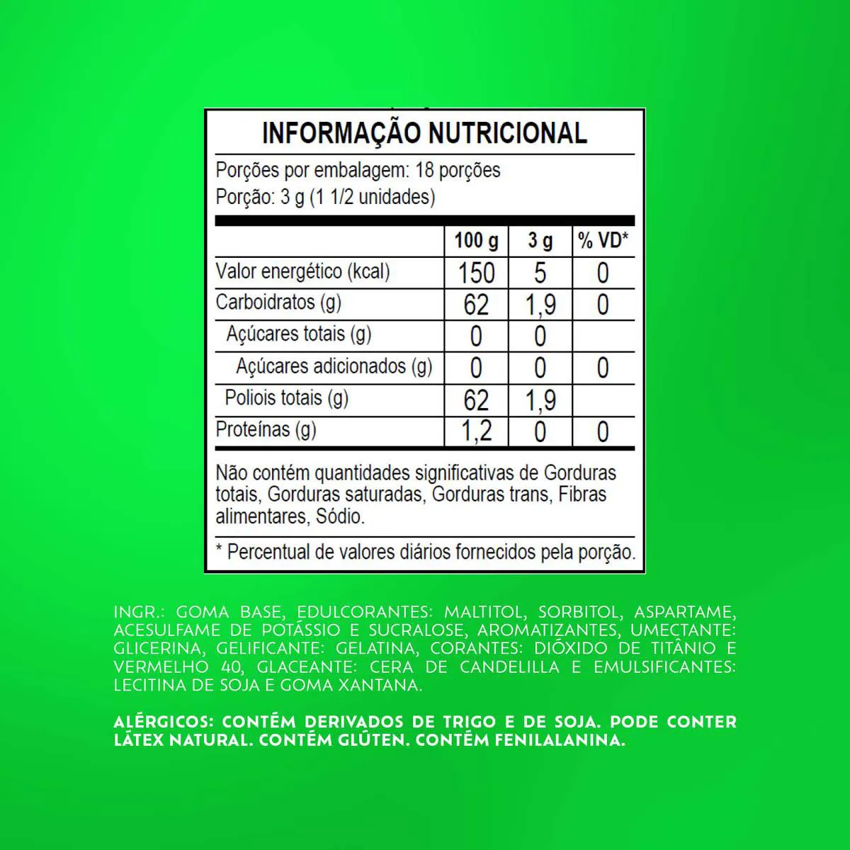 Goma base, óleo vegetal, edulcorantes: maltitol, sorbitol, aspartame e acesulfame de potássio, umectante: glicerina, aromatizantes, gelificante: gelatina, acidulante: ácido cítrico, regulador de acidez: ácido málico, emulsificantes: lecitina de soja e goma xantana, corantes: dióxido de titânio, tartrazina e azul brilhante FCF e glaceante: cera candelilla.