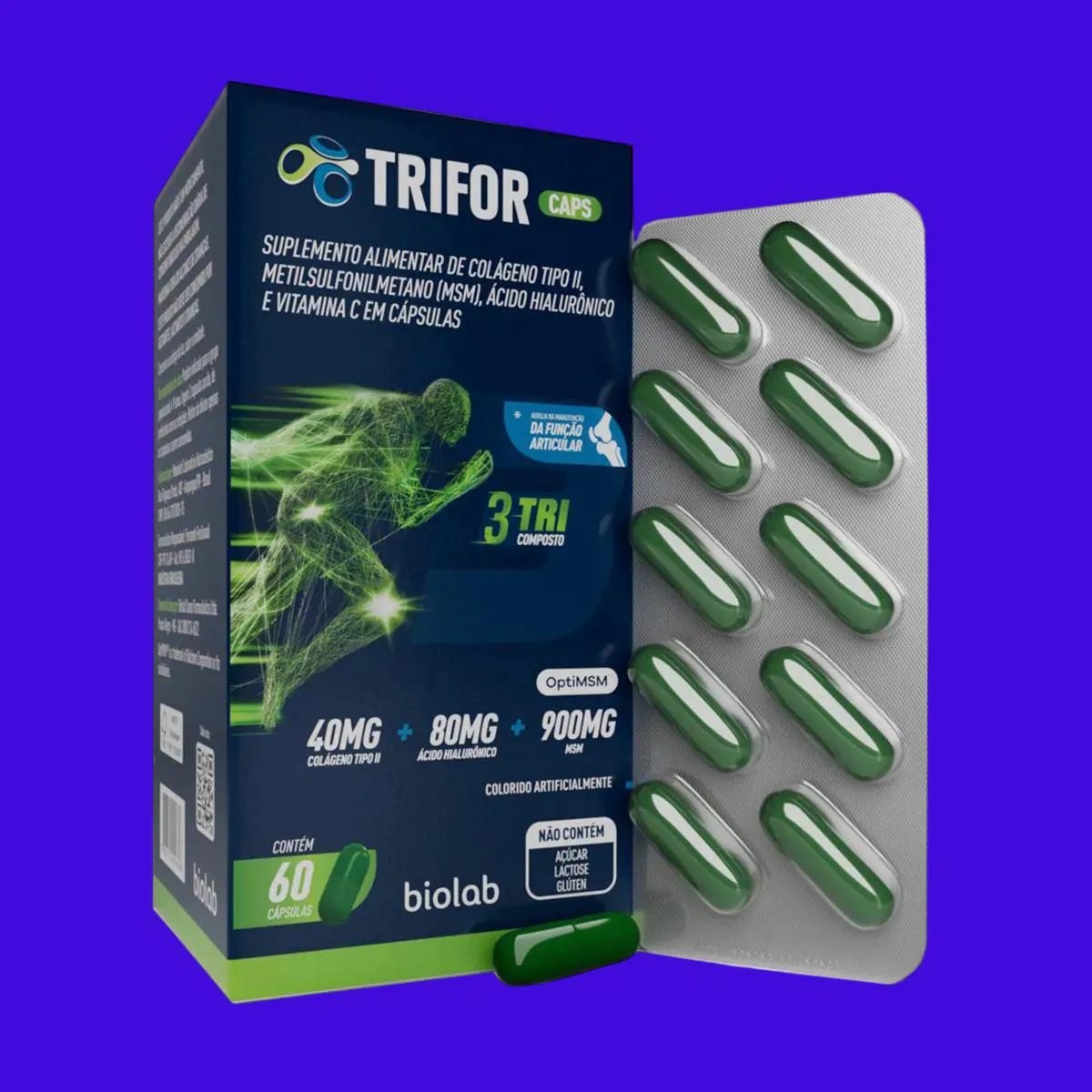 O Trifor é um suplemento alimentar formulado com colágeno Tipo II não desnaturado, Ácido Hialurônico, vitamina c e Metilsulfonilmetano (MSM), nutrientes essenciais para manutenção das articulações, proteção da cartilagem e suporte à mobilidade.