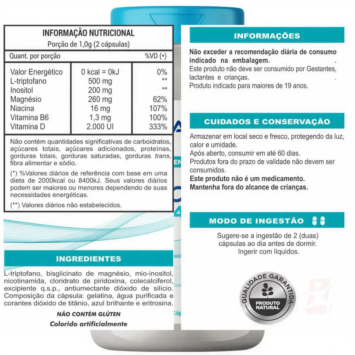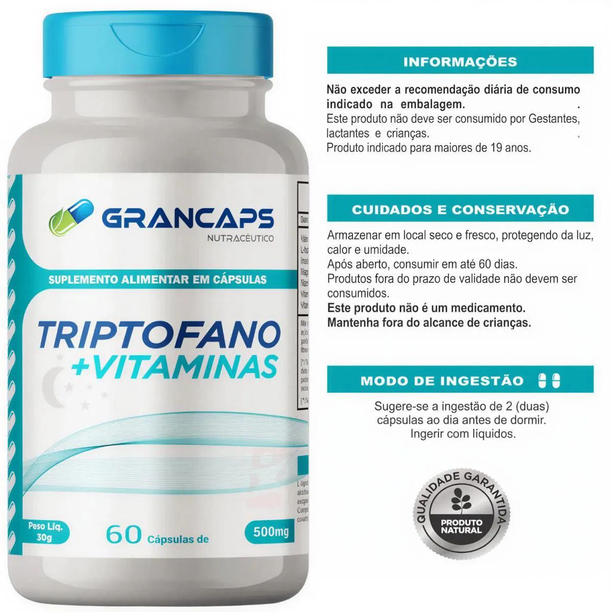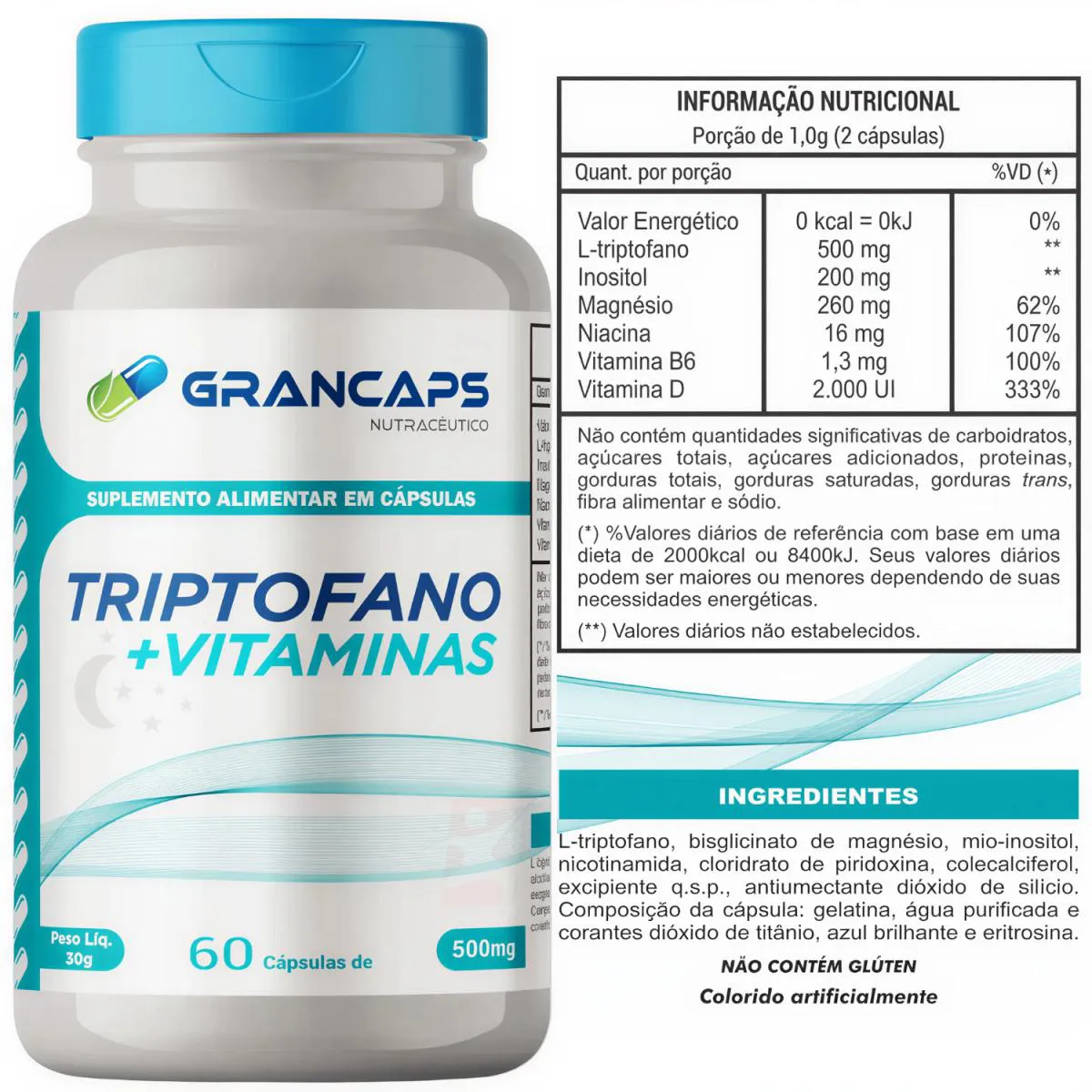 TRIPTOFANO + INOSITOL + NIACINA + MAGNÉSIO + VITAMINAS D e B6 60 CÁPSULAS - GRANCAPS DESCRIÇÃO O Triptofano + Vitaminas auxilia a sintetizar a serotonina, regular o sono, ajudar em casos de hiperatividade, melhorar a resistência a insulina, diminuir a sensação de cansaço. O desequilíbrio de Triptofano no organismo está diretamente ligado aos quadros de depressão, sendo assim, ele também pode auxiliar no tratamento da depressão e também nos casos de estresse e transtorno de ansiedade. BENEFÍCIOS - Auxilia a sintetizar a serotonina; - Pode auxiliar a regular o sono; - Pode auxiliar em casos de hiperatividade; - Pode auxiliar a diminuir a sensação de cansaço; - SEM GLÚTEN. SUGESTÃO DE USO Sugere-se a ingestão de 2 (duas) cápsulas ao dia antes de dormir. Ingerir com líquidos. TABELA NUTRICIONAL – COMPOSIÇÃO – RECOMENDAÇÕES Anexo nas imagens. DADOS TÉCNICOS Registro ANVISA – Produto autorizado para comercialização em todo o território nacional, através do anexo I da RDC 240/20218 e anexo X da RDC 23/2000. Marca – GRANCAPS. Conteúdo líquido por fraco – 60 cápsulas. Rendimento líquido por frasco –30 doses/porções. Peso líquido por frasco – 30g. Peso bruto por frasco – 100g. Peso aproximado produto + embalagem – 100g. Código de barras (EAN) – 7898704671380. Dimensões do produto – altura 11 cm; largura 6 cm; comprimento 6 cm. Dimensões da embalagem de envio – altura 7 cm; largura 10 cm; comprimento 15cm. ITENS DO ANÚNCIO - 1 Unidade do produto: TRIPTOFANO + INOSITOL + NIACINA + MAGNÉSIO + VITAMINAS D e B6 60 CÁPSULAS – GRANCAPS. Total - 60 Cápsulas.