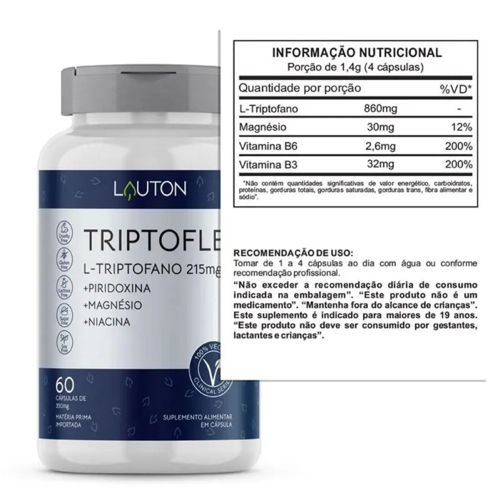 Descrição do Produto: O Triptoflex Triptofano ajuda a melhorar tanto a qualidade, quanto prolongar a duração do sono. Estimula a liberação do GH, o hormônio do crescimento e ajuda a controlar os sintomas da TPM, estabilizando as oscilações de humor. Além disso, controla o apetite, auxiliando no emagrecimento e reduz a vontade de comer carboidratos. Reduz os sintomas associados ao estresse e à ansiedade, uma vez que pode diminuir a secreção de cortisol, o hormônio do estresse. Beneficios: -Ajuda a melhorar tanto a qualidade, quanto prolongar a duração do sono; - Estimula o a liberação do GH, o hormônio do crescimento; - Ajuda a controlar os sintomas da TPM, estabilizando as oscilações de humor; - Controla o apetite, auxiliando no emagrecimento e reduz a vontade de comer carboidratos; - Reduz os sintomas associados ao estresse e à ansiedade, uma vez que pode diminuir a secreção de cortisol, o hormônio do estresse.