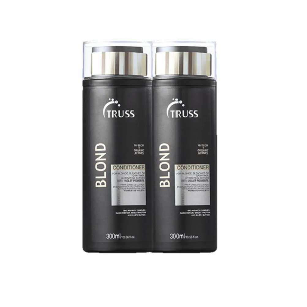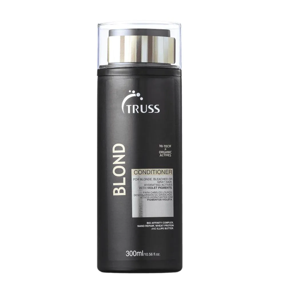 Truss Blond Conditioner contém pigmentos violetas que eliminam o amarelamento da oxidação dos fios, causado pela exposição ao sol, uso de ferramentas de calor e demais agressões. Além disso, possui tecnologia que trata os fios de dentro para fora. Ela aumenta elasticidade e sela as cutículas, o que confere maior resistência contra a quebra, além de luminosidade constante e maciez que dura o dia inteiro.