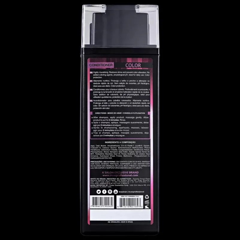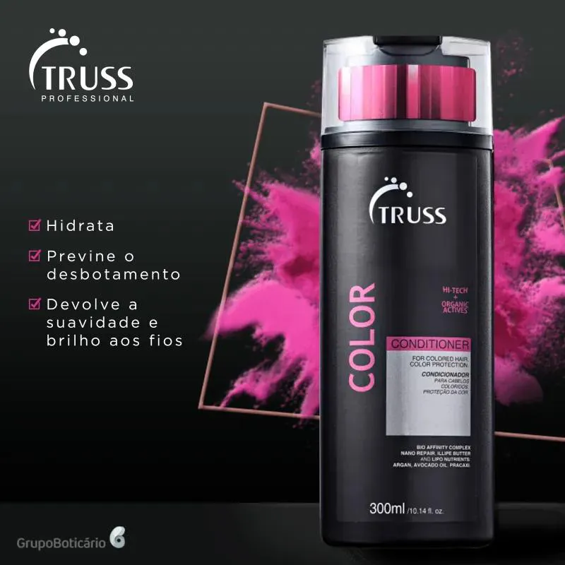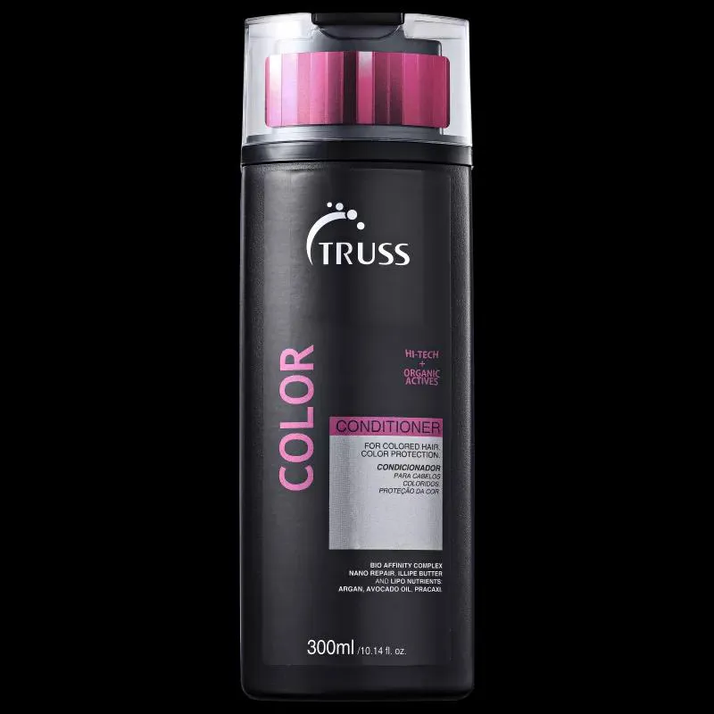 Condicionador para cabelos coloridos ou com mechas. Truss Color Conditioner hidrata e previne o desbotamento e alteração da cor. Também devolve a suavidade, o brilho e a saúde dos fios.
