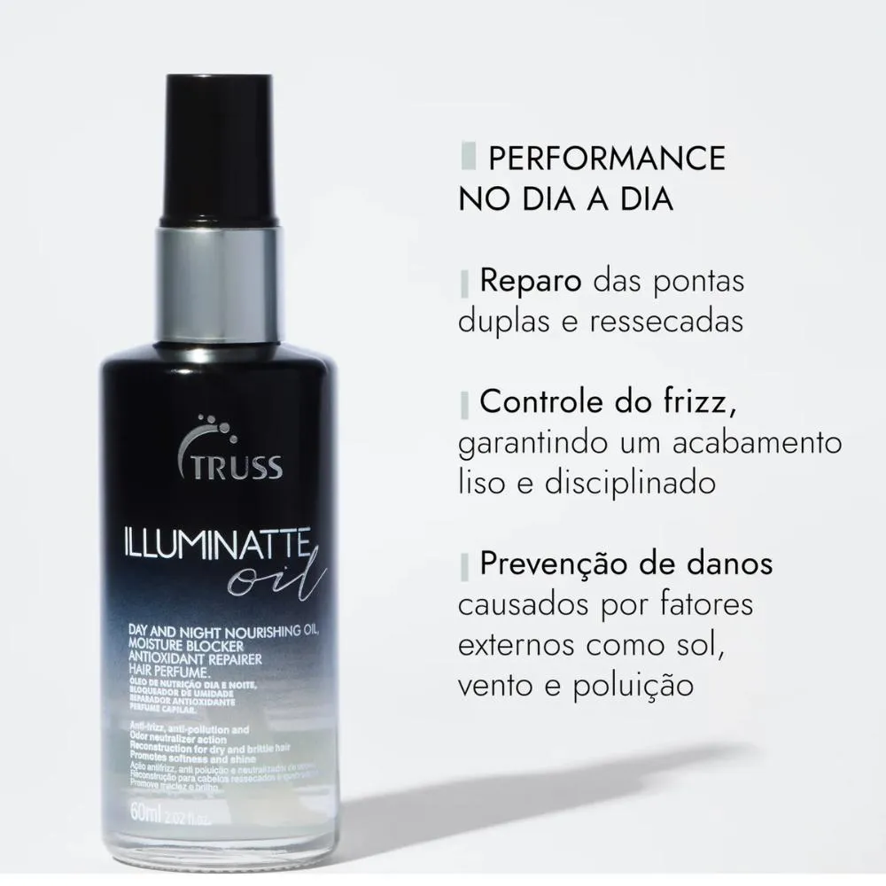 O Óleo Capilar TRUSS ILLUMINATTE OIL é um finalizador ideal para cabelos ressecados e quebradiços. Promove reparação de pontas e controle de frizz, combatendo os danos causados pela exposição solar e poluição. Tem ação antioxidante que é capaz ainda de eliminar os maus odores promovidos pela fumaça, óleo de fritura, cigarro e outros por até 8 horas. Confere cabelos fortalecidos e com proteção térmica, além de nutrir com intensidade durante o dia ou à noite. Sua fragrância agradável traz um fundo floral-frutal, conferindo uma perfumação efetiva para os cabelos com duração prolongada.