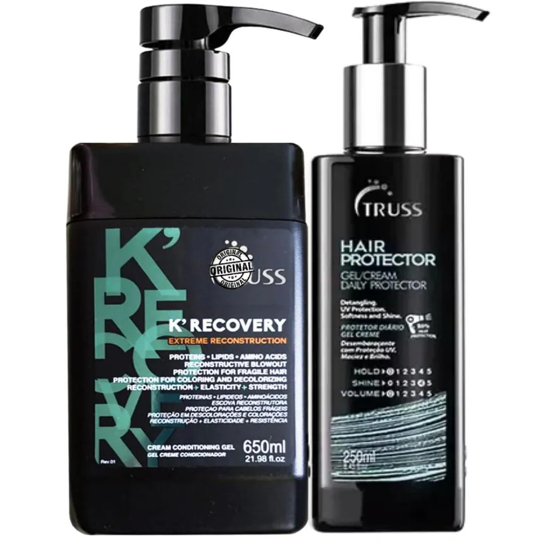 01 Keratin Recovery Reconstrutor Capilar - 650ml 01 Protetor Diário/Térmico Hair Protector - 250ml 01 Válvula NOTA: PRODUTO COM IMAGEM ILUSTRATIVARECONSTRUTOR CAPILAR RECOVERY: Para rápida recuperação capilar, Pode ser utilizado em diversos processos que necessitem de reconstrução ágil, pois age tanto no interior (córtex) quanto no exterior (cutículas) da fibra capilar. Recupera os cabelos durante o processo de escova Reconstrutora, aumenta resistência e flexibilidade através do tratamento Choque de Queratina (proteínas veganas) e mantém a integridade dos cabelos durante processos de ultra descolorações. DICAS DE UTILIZAÇÃO:Escova Reconstrutora: Lave os cabelos com o shampoo e condicionador mais adequado ao tipo de cabelo. Retire todo excesso de água com uma toalha e aplique de 2 a 4 pumps (7 a 14ml) de K-Recovery, envolvendo os fios, Seque fazendo escova. Pré-tratamento – descolorações e colorações: Antes do processo de descoloração ou coloração, nos cabelos secos, aplique nos fios mais fragilizados de 2 a 4 pumps de K-Recovery; Seque e inicie o processo de Mechas. Pós-tratamento – descolorações e colorações: Após o enxágue do Pó Descolorante, aplique de 2 a 4 pumps de K-Recovery nos cabelos; Massageie e enxague; Aplique Net Mask para uma poderosa recuperação instantânea, Massageie e Enxague. Choque de proteína (K-Restore): Lave com Shampoo TRUSS, retire o excesso de água. Aplique o gel creme condicionador K-Recovery, mecha a mecha; Enluve e Não enxágue;Seque os fios, e depois de secos, enxague; Aplique Intensive Nutrition, massageie durante 5 minutos e enxágue. RESULTADOS: