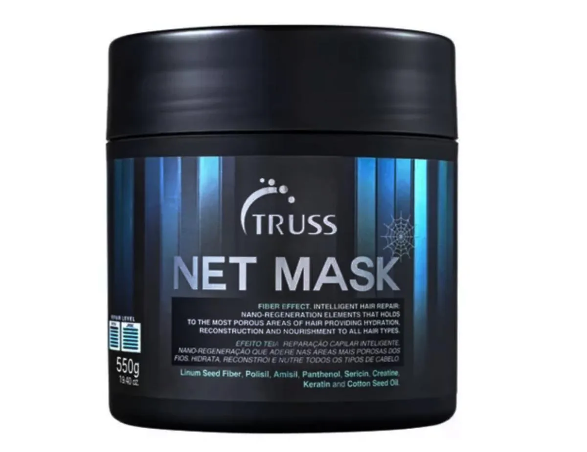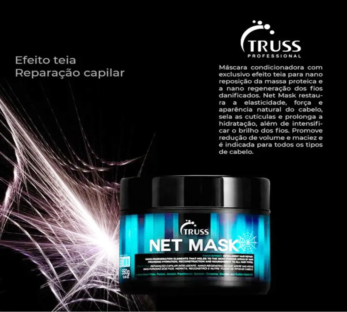 NET MASK: A Net Mask TRUSS proporciona a nano-reposição da massa proteica e a nano-regeneração dos fios danificados, restaurando a elasticidade, força e aparência natural dos cabelos. Sela as cutículas, prolonga a hidratação, além de intensificar o brilho dos fios. Promove redução de volume e maciez.