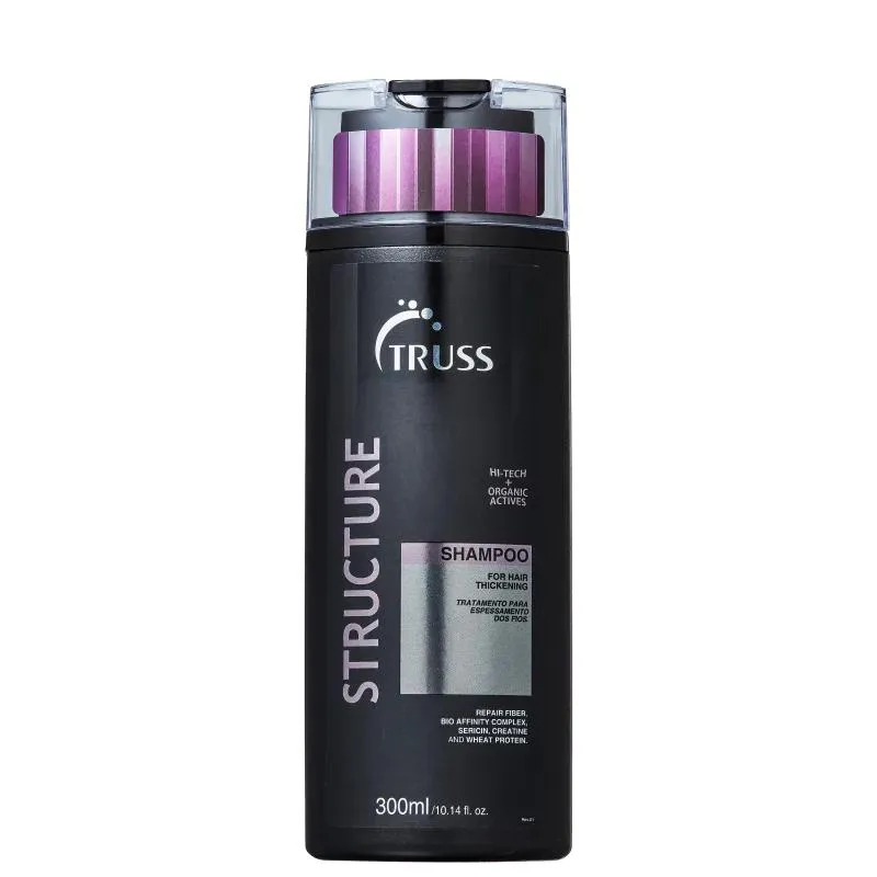 shampoo para cabelos finos e danificados. Shampoo Truss Structure higieniza enquanto recupera a elasticidade e resistência, além de proporcionar espessura e força aos cabelos finos. Shampoo Truss Structure auxilia no espessamento, pois forma uma película que envolve os fios, recuperando e encorpando fibras danificadas. Possui pH fisiológico, limpa sem agredir os fios. Aplique sobre o cabelo molhado e massageie com as pontas dos dedos. Enxágue bem e repita a operação. Para prolongar e potencializar os efeitos da fórmula, sempre utilize produtos da mesma linha durante a sua rotina de cuidado com os fios. Repair Fiber: penetra na fibra capilar para reparação intensiva. Envolve os fios, encorpando consideravelmente sua espessura, reparando danos causados por processos químicos e mecânicos. Proporciona cabelos fortes, blindados e resistentes. Ação anti-aging. Nano Repair: micropartículas que se depositam uniformemente sobre o fio de cabelo, com alto teor de cargas amínicas (positivas), formam filme de proteção, promovendo redução de frizz, proteção da cor, brilho interno, toque sedoso e condicionamento intenso. Sericina: fortalece a fibra, garante sedosidade, maleabilidade e força ao cabelo, deixando os fios mais disciplinados e com brilho. Creatina: poderoso derivado aminoácido, micropartícula que penetra profundamente na fibra capilar, aumentando a resistência da fibra capilar. Biocisteína: restaura a flexibilidade e resistência dos fios. Wheat Protein: proteínas vegetais que formam filme hidratante e protetor e melhoram a estabilidade da cor em cabelos coloridos. Fios mais encorpados, fortes, macios e com brilho.