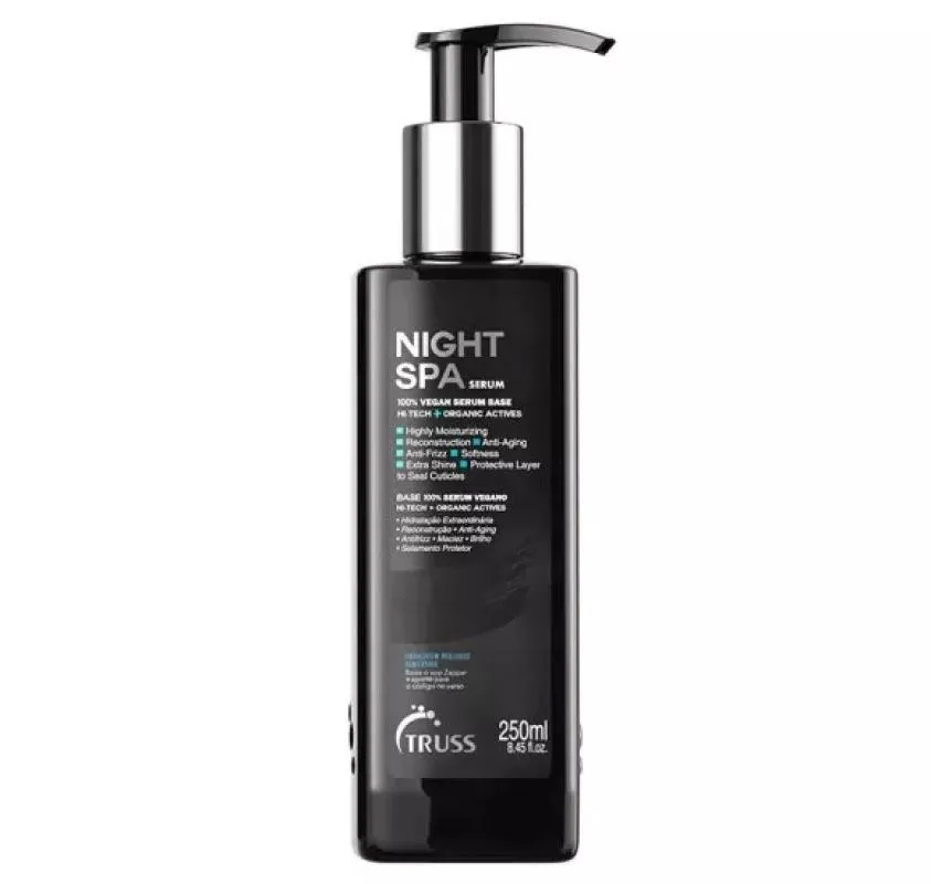 Hidratação Profunda, brilho e maciez. SÉRUM NIGHT SPA: Sérum de tratamento noturno para todos os tipos de cabelos. Promove hidratação profunda que revitaliza os fios. Proporciona uma blindagem que mantém os nutrientes dentro da fibra capilar. Previne a ação dos agentes externos, que reduzem o frizz e aumenta o brilho. Regenera a fibra capilar danificada e disciplina fios arrepiados.