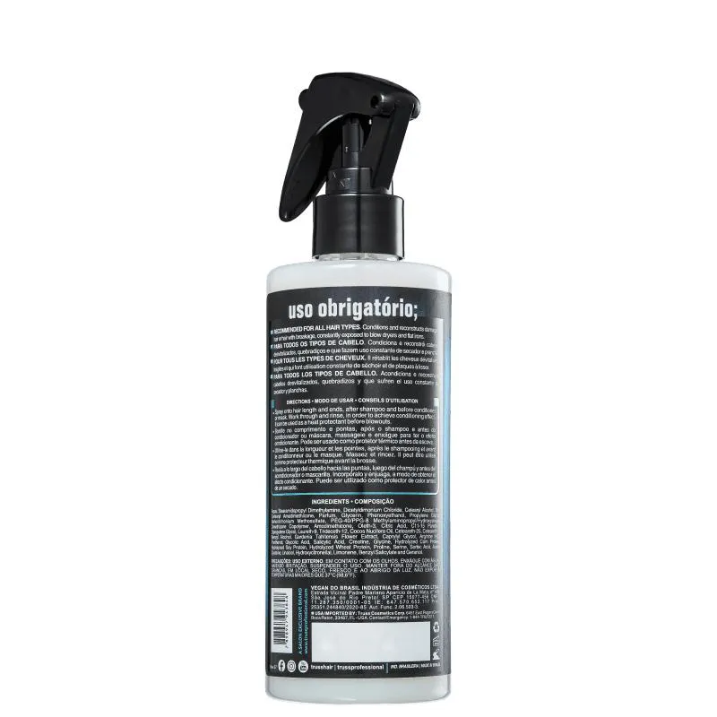 Reconstrutor para cabelos danificados. Truss Uso Obrigatório recupera o aspecto saudável enquanto disciplina e protege do calor. O Tratamento Reconstrutor Truss Uso Obrigatório age com a reconstrução das partes do fio fragilizadas, a fim de restaurar a força e a resistência. A fórmula ainda conta com antioxidantes, que protegem dos danos causados por radicais livres ao mesmo tempo em que recupera os fios tingidos contra o desbotamento. Truss Uso Obrigatório também evita a formação de pontas duplas.