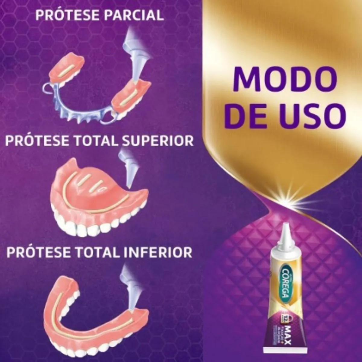 Ultra Corega Max Creme Sem Sabor possui fixação de 12 horas, além de selar a prótese, garantindo o bloqueio da passagem de partículas de comida.