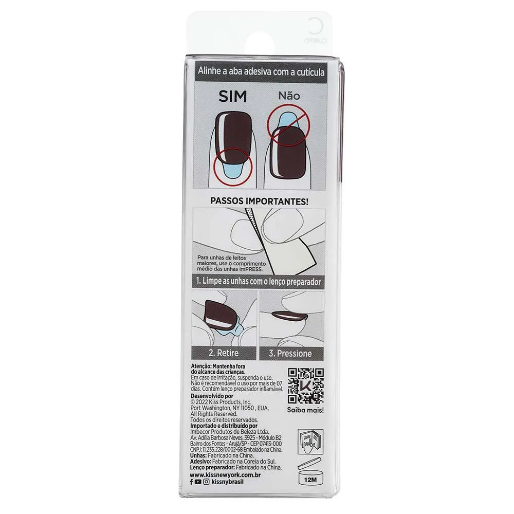 Cada caixinha de imPRESS Color contém 30 unhas com 12 tamanhos diferentes para possibilitar mais de uma aplicação, além de um kit completo com lencinho preparador, lixa e palito de unha.