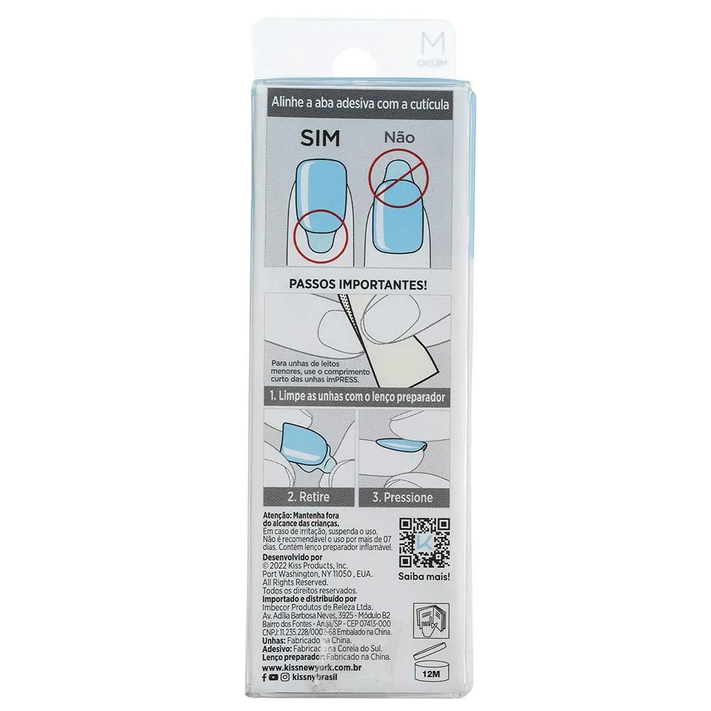 Cada caixinha de imPRESS Color contém 30 unhas com 12 tamanhos diferentes para possibilitar mais de uma aplicação, além de um kit completo com lencinho preparador, lixa e palito de unha. Depois que você conhecer a praticidade e beleza das unhas imPRESS, nunca mais vai querer ficar esperando o esmalte secar!