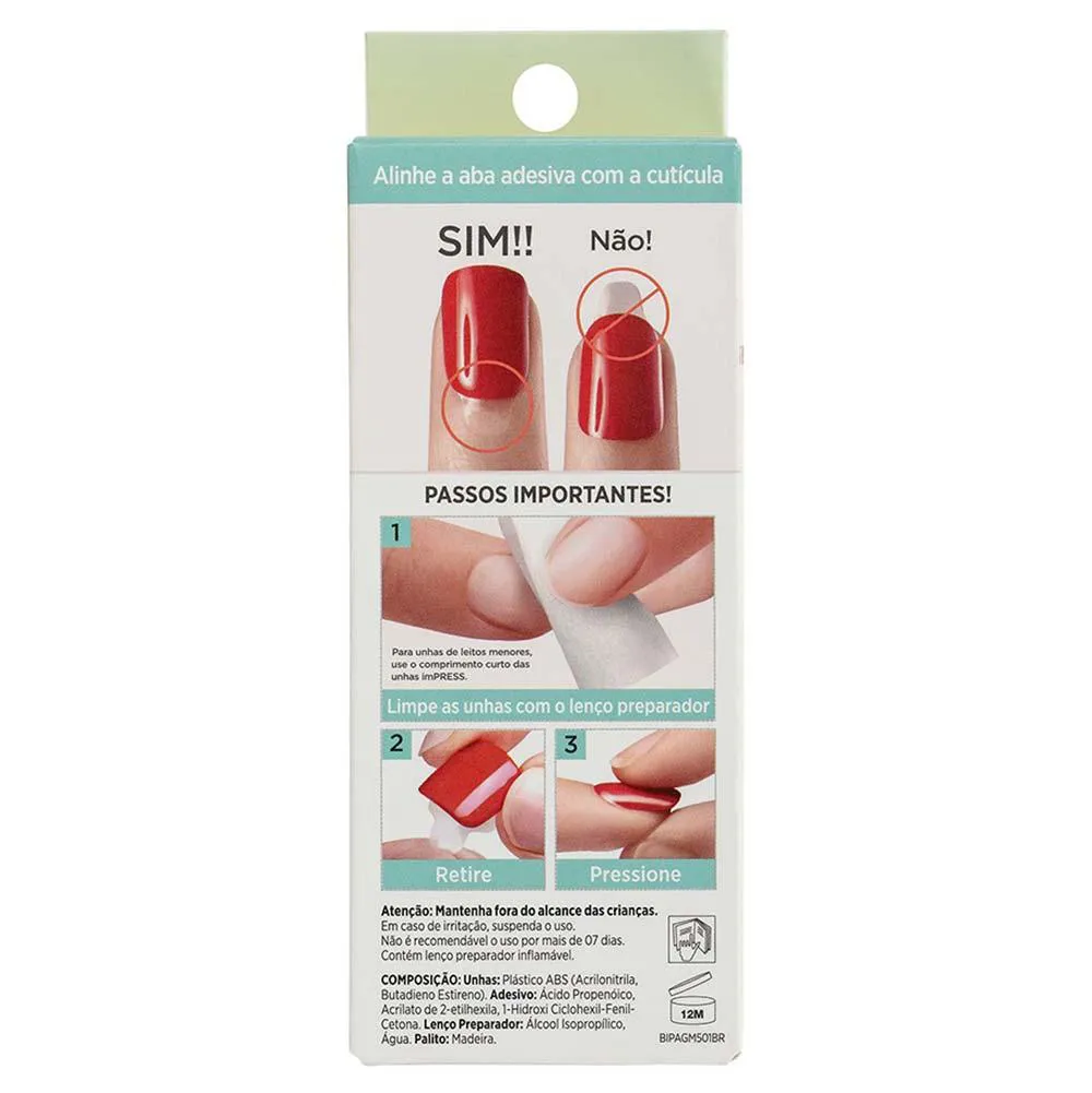 As Unhas Postiças Autocolantes imPRESS são a melhor opção para você que busca resultado de salão em casa. Com tecnologia Super Hold (patenteada), a dupla camada de adesivo é a responsável por garantir unhas perfeitas por até 7 dias, sem danificar suas unhas naturais. Todos os modelos têm o diferencial da tecnologia Pure Fit, que conta com cutículas afiladas e pontas 14% mais finas e resistentes que proporcionam um encaixe perfeito, além de um acabamento muito mais natural.