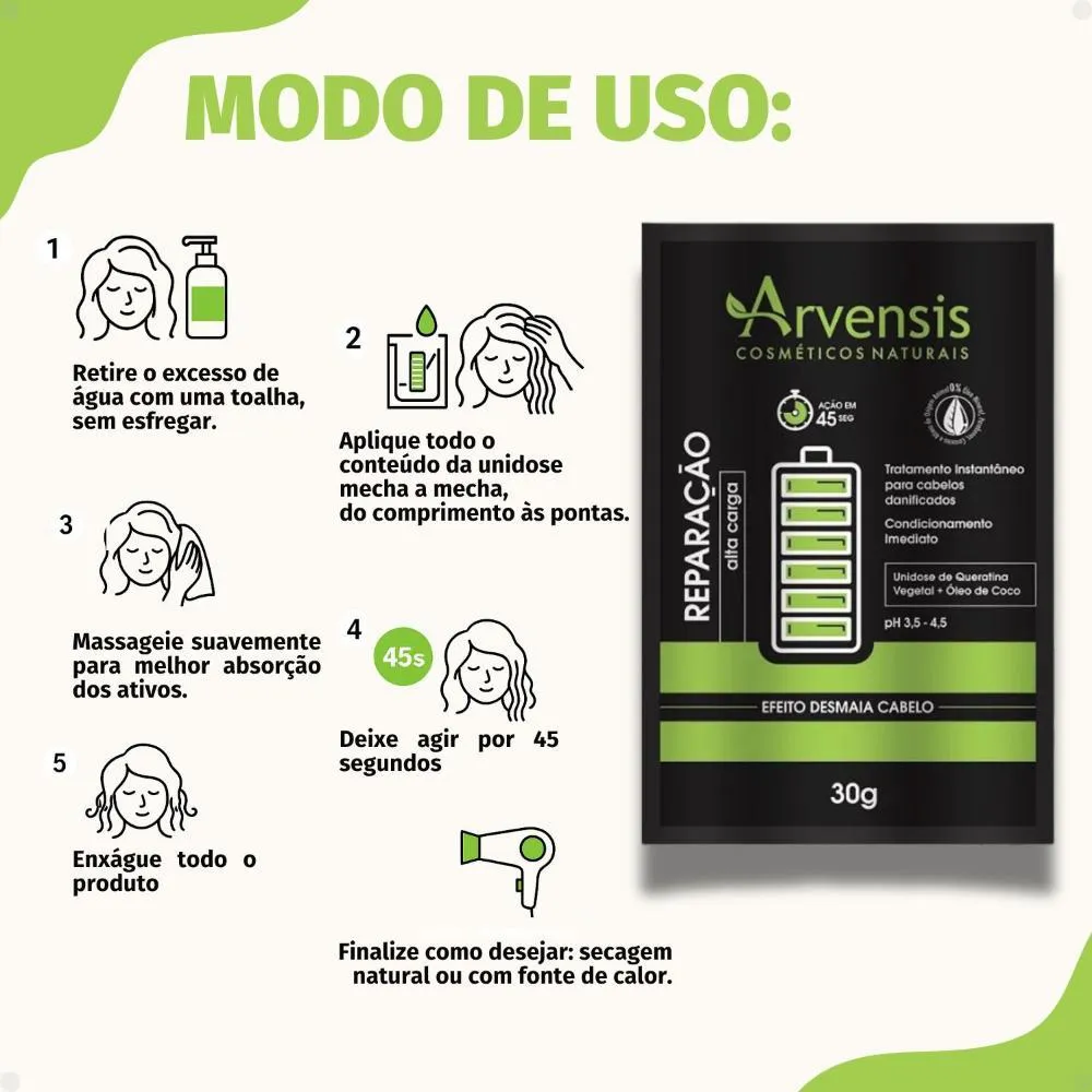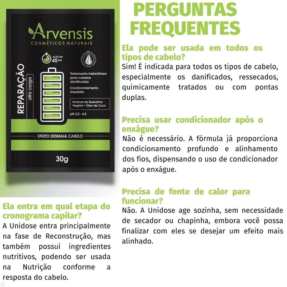 Unidose Arvensis Reparação 30g A Unidose Arvensis Reparação 30g é um tratamento de ação rápida e profunda, ideal para quem precisa restaurar a saúde dos fios de forma prática e eficaz. Com uma combinação poderosa de ativos reconstrutores, hidratantes e nutritivos, a fórmula age em minutos para devolver força, brilho, flexibilidade e maciez aos cabelos fragilizados, especialmente os que passaram por processos químicos, colorações ou uso excessivo de calor. Sua textura cremosa e concentrada promove condicionamento imediato, com efeito "desmaia cabelo", facilitando o desembaraço e deixando os fios mais alinhados, sedosos e visivelmente mais saudáveis logo na primeira aplicação. A Unidose é prática e perfeita para incluir no seu cronograma capilar como uma dose de reconstrução e nutrição intensa, além de ser ideal para levar em viagens, usar no pós-química ou como um SOS capilar. . Modo de usar: Após lavar os cabelos com shampoo, aplicar a dose única nos cabelos e massagear suavemente.Deixar em contato por 45 segundos e enxaguar. Precauções: Somente para uso externo. Manter fora do alcance de crianças. Caso occorer alguma irritação, suspender o uso. Manter em local fresco e longe da iluminação solar. . Perguntas Frequentes Ela pode ser usada em todos os tipos de cabelo? Sim! É indicada para todos os tipos de cabelo, especialmente os danificados, ressecados, quimicamente tratados ou com pontas duplas. Ela entra em qual etapa do cronograma capilar? A Unidose entra principalmente na fase de Reconstrução, mas também possui ingredientes nutritivos, podendo ser usada na Nutrição conforme a resposta do cabelo. Precisa usar condicionador após o enxágue? Não é necessário. A fórmula já proporciona condicionamento profundo e alinhamento dos fios, dispensando o uso de condicionador após o enxágue. Precisa de fonte de calor para funcionar? Não. A Unidose age sozinha, sem necessidade de secador ou chapinha, embora você possa finalizar com eles se desejar um efeito mais alinhado. . Código de Registro Sanitário (ANVISA) 25351.562647/2017-53