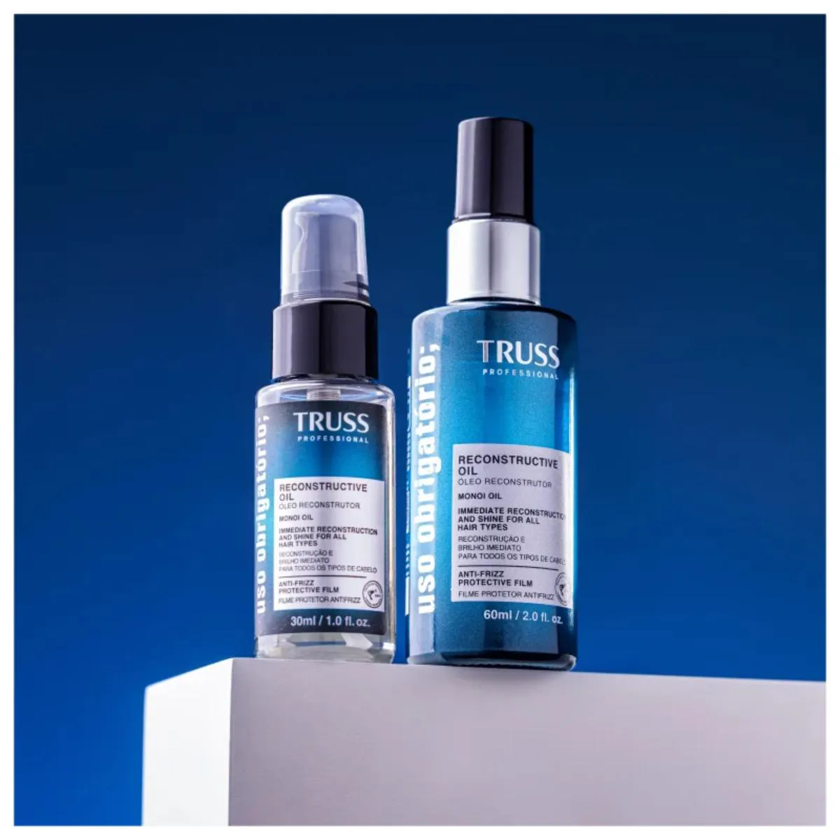 Óleo reconstrutor para cabelos danificados, ressecados e fragilizados. TRUSS Uso Obrigatório é um produto revolucionário que reúne o poder de um condicionador líquido, leave-in e tratamento profundo em uma única fórmula.O Óleo Capilar Reconstrutor TRUSS Uso Obrigatório foi desenvolvido com alta tecnologia e presente nos melhores salões de beleza do mundo, oferecendo blindagem completa contra danos térmicos, químicos e ambientais, além de proporcionar maciez, flexibilidade e controle do frizz. Sua textura leve garante rápida absorção e um acabamento impecável, sem pesar nos fios.
