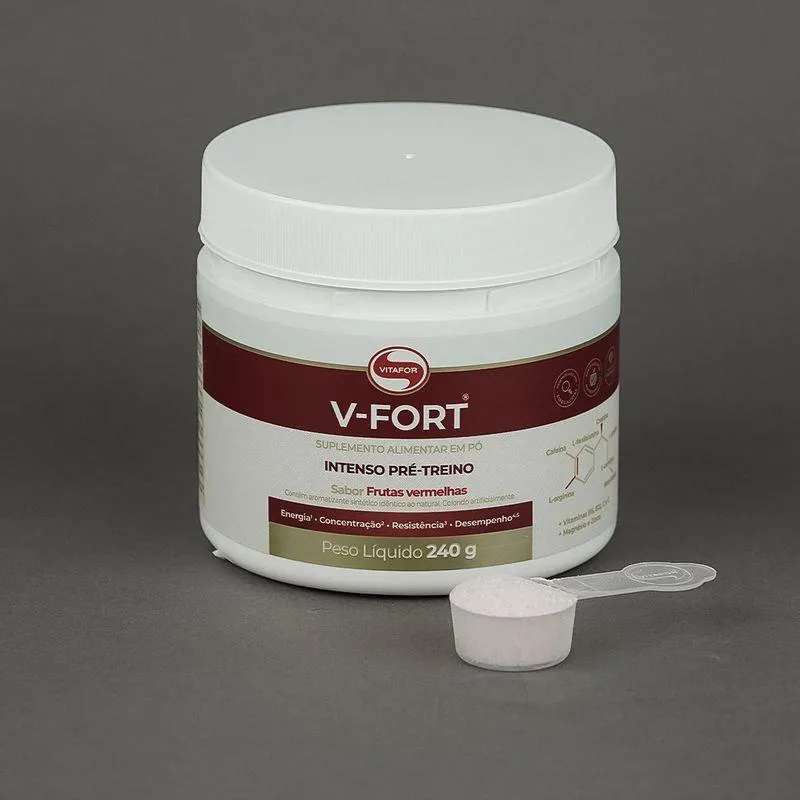 V-Fort Vitafor Frutas Vermelhas 240g é um suplemento pré-treino formulado para fornecer energia e nutrientes essenciais para otimizar o desempenho durante o treino. Confira algumas características e benefícios deste produto: Energia e Disposição: V-Fort Pré-Treino é formulado com ingredientes que proporcionam energia e disposição para o treino, ajudando a melhorar o desempenho durante a atividade física. Sabor Refrescante de Frutas Vermelhas: Com um delicioso sabor de frutas vermelhas, V-Fort Pré-Treino torna a preparação para o treino mais agradável e saborosa. Formulação Especializada: A fórmula de V-Fort Pré-Treino é cuidadosamente elaborada para fornecer os nutrientes necessários para um treino eficaz, incluindo vitaminas, minerais e compostos energéticos. Aumento da Resistência: Os ingredientes de V-Fort Pré-Treino podem ajudar a aumentar a resistência durante o treino, permitindo um desempenho mais consistente e duradouro. Melhora do Foco Mental: Além de fornecer energia física, V-Fort Pré-Treino pode ajudar a melhorar o foco mental e a concentração durante o treino, contribuindo para um melhor desempenho geral. Prático e Fácil de Consumir: Apresentado em embalagem de 240g, V-Fort Pré-Treino é prático de transportar e de consumir, podendo ser misturado com água ou suco antes do treino. Qualidade e Segurança: V-Fort Pré-Treino é produzido com ingredientes de alta qualidade e passa por rigorosos controles de qualidade para garantir um produto seguro e eficaz. Desfrute de um Treino Mais Eficiente: Com V-Fort Pré-Treino Frutas Vermelhas 240g, você pode aproveitar ao máximo seu treino, fornecendo ao seu corpo os nutrientes e a energia necessários para um desempenho superior.