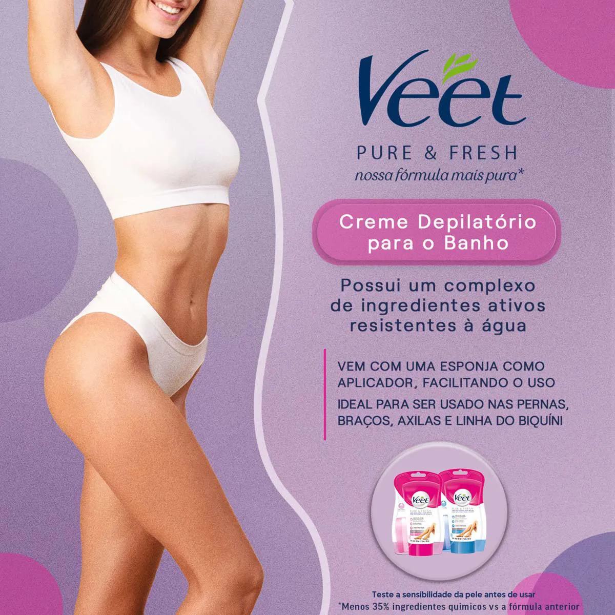 O Creme Depilatório Para Banho Veet Pure & Fresh é um produto desenvolvido especialmente para peles delicadas (normais e secas), apresentado em embalagem de 150ml. Serve para remover pelos de forma eficaz durante o banho, agindo próximo à raiz, mesmo em pelos curtos, proporcionando suavidade de longa duração e mantendo a pele hidratada por até 24 horas.