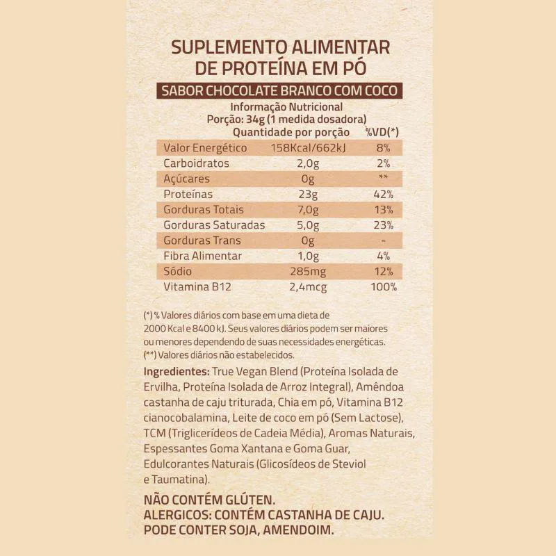 A Proteína Vegan sabor chocolate branco com coco, da True Source, é elaborada com um blend de proteínas da ervilha, arroz integral, chia e da castanha de caju. Possui boa quantidade de BCAAs e glutamina, além de conter 100% da necessidade diária da vitamina B12, sendo ideal para veganos e vegetarianos.
