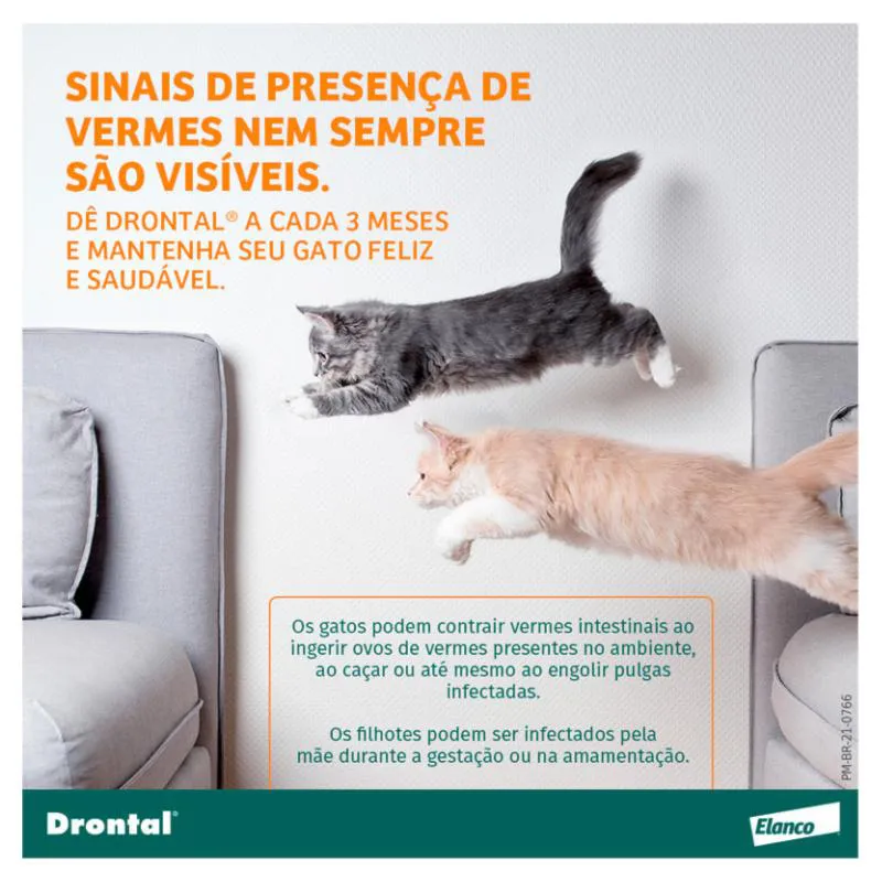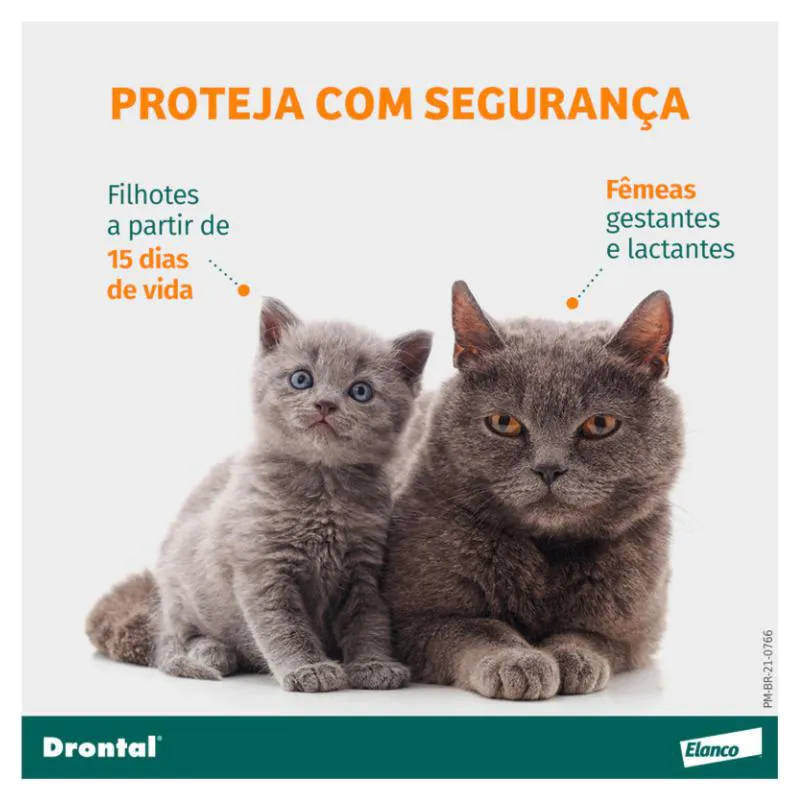 Não se recomenda a administração do Vermífugo Drontal em felinos com menos de 2 semanas. Se recomenda a administração do Vermífugo Drontal 4 vezes ao ano para uma melhor proteção contra as verminoses.