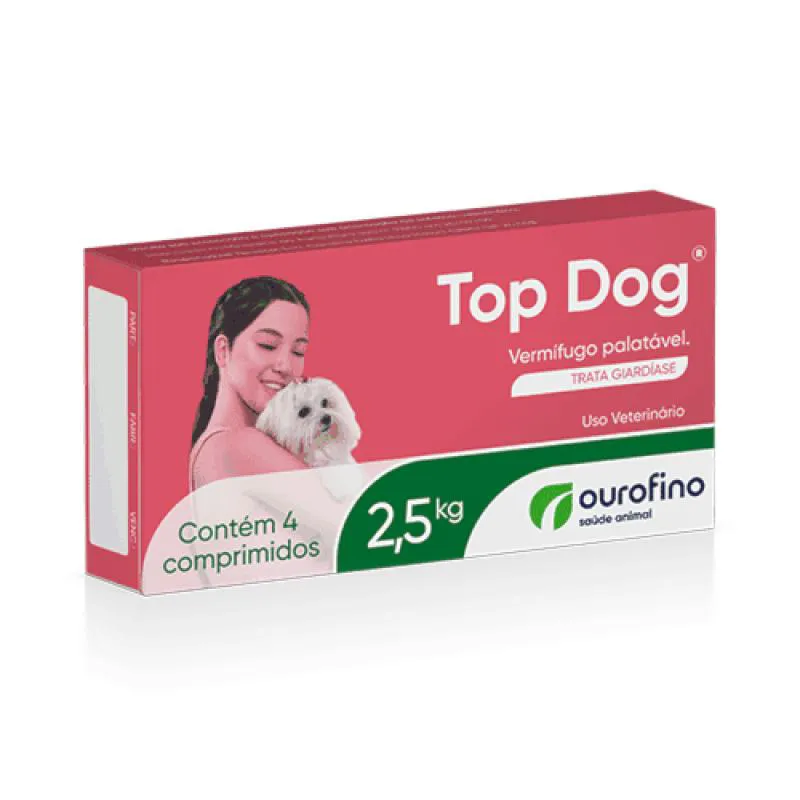 Top Dog é um vermífugo palatável, indicado para o controle de parasitas internos (helmintos) com atuação em vermes redondos (nematódeos) e vermes chatos (cestódeos). É também indicado para o tratamento da Giardíase (causada pelo protozoário Giardia sp).