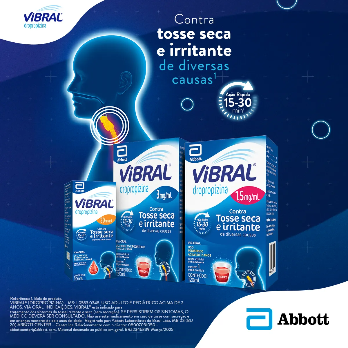 Vibral é um xarope indicado para o tratamento da tosse seca e alérgica, proporcionando alívio rápido dos sintomas entre 15 e 30 minutos após a administração. Com uso oral e dosagem ajustada por faixa etária, é seguro para adultos e crianças acima de 2 anos. Ideal para quem busca conforto e bem-estar com eficácia e praticidade, Vibral é uma opção confiável para toda a família.