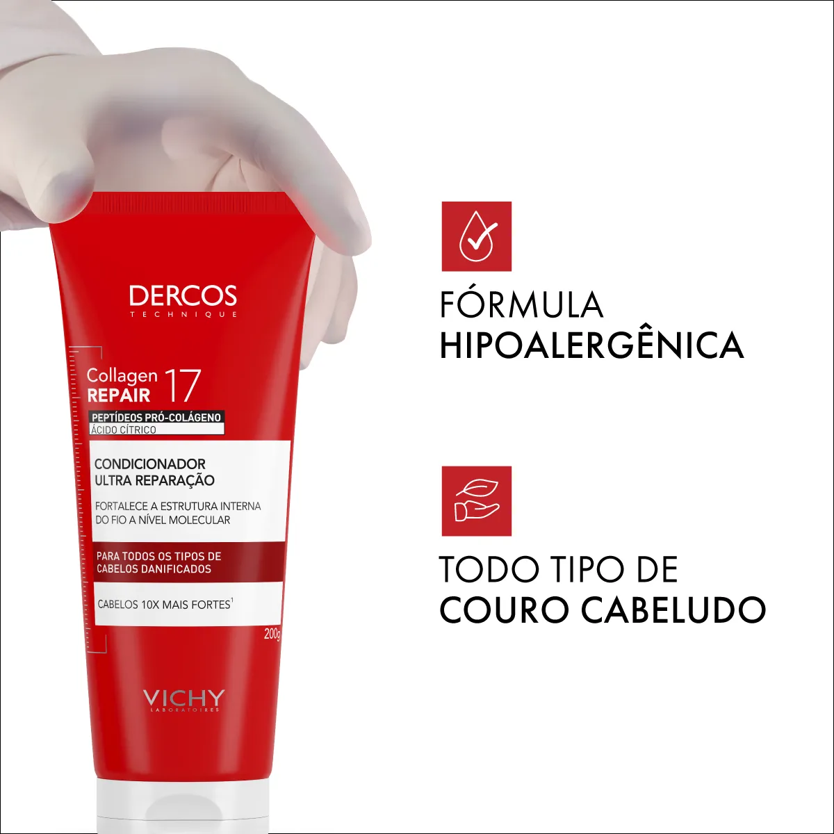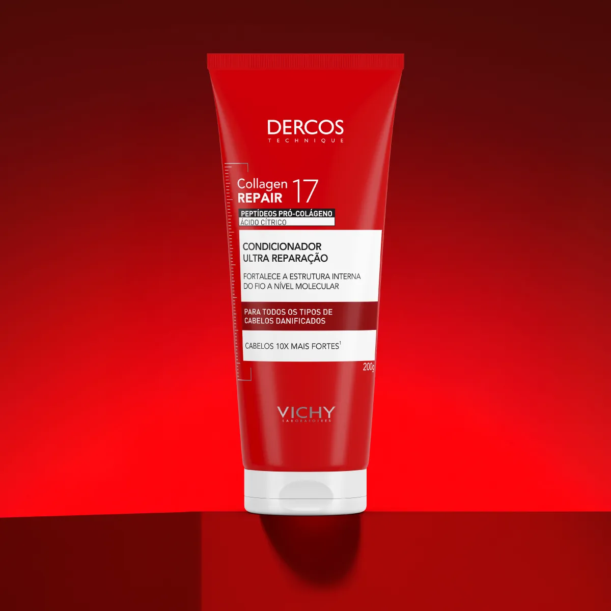 O Condicionador Ultra Reparação Vichy Dercos Collagen 17 é potencializado com peptídeos pró-colágeno e ativos de alta performance que fortalecem e reparam a fibra capilar, promovendo brilho, maciez e resistência.