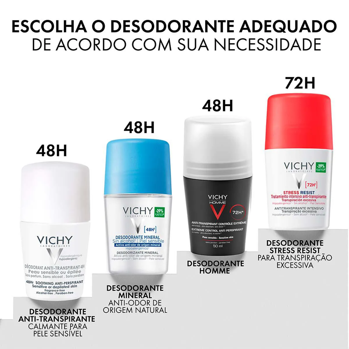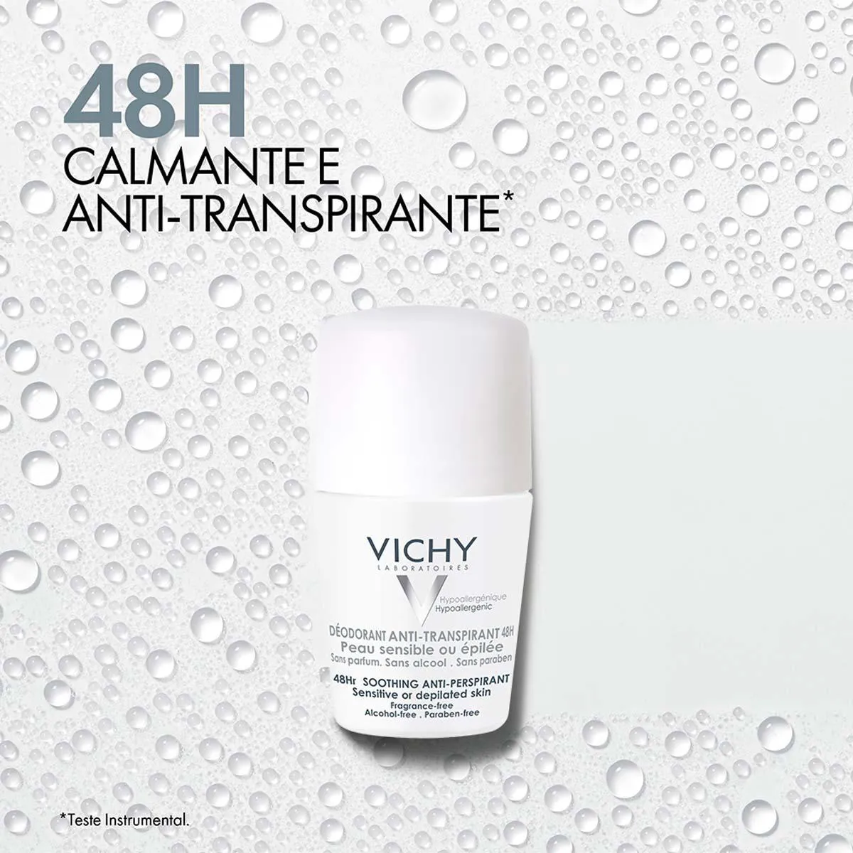 O Desodorante Antitranspirante Vichy Roll-On foi desenvolvido para peles sensíveis, ou para o pós-cera ou barbear. Ele ajuda a controlar a transpiração da pele diariamente e com duração prolongada. O produto possui como componente principal a água vulcânica da Vichy, proveniente dos vulcões de Auvergne, região histórica da França. Rico em 15 minerais, ajuda a proteger a pele mais sensível, garantindo ação antitranspirante e calmante.